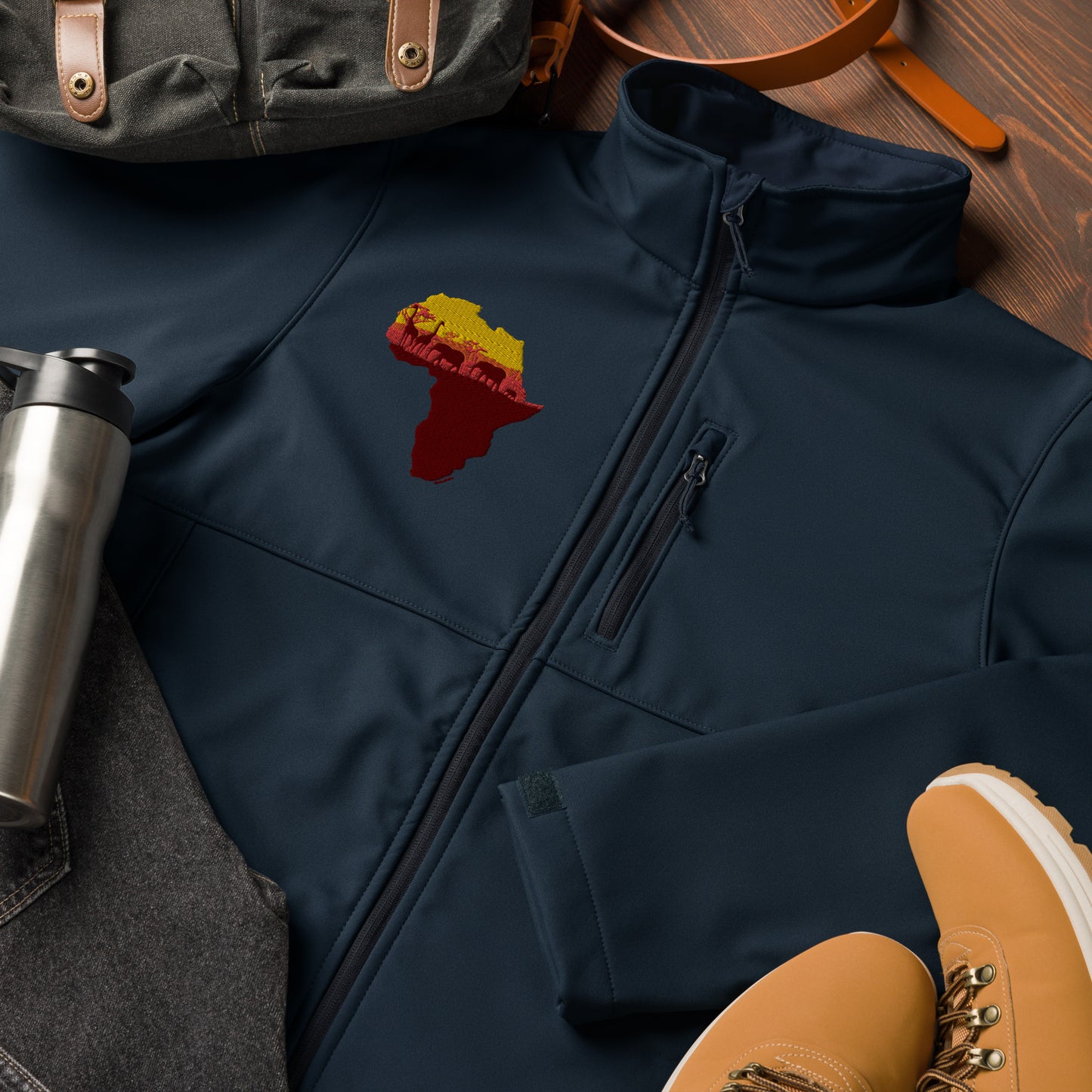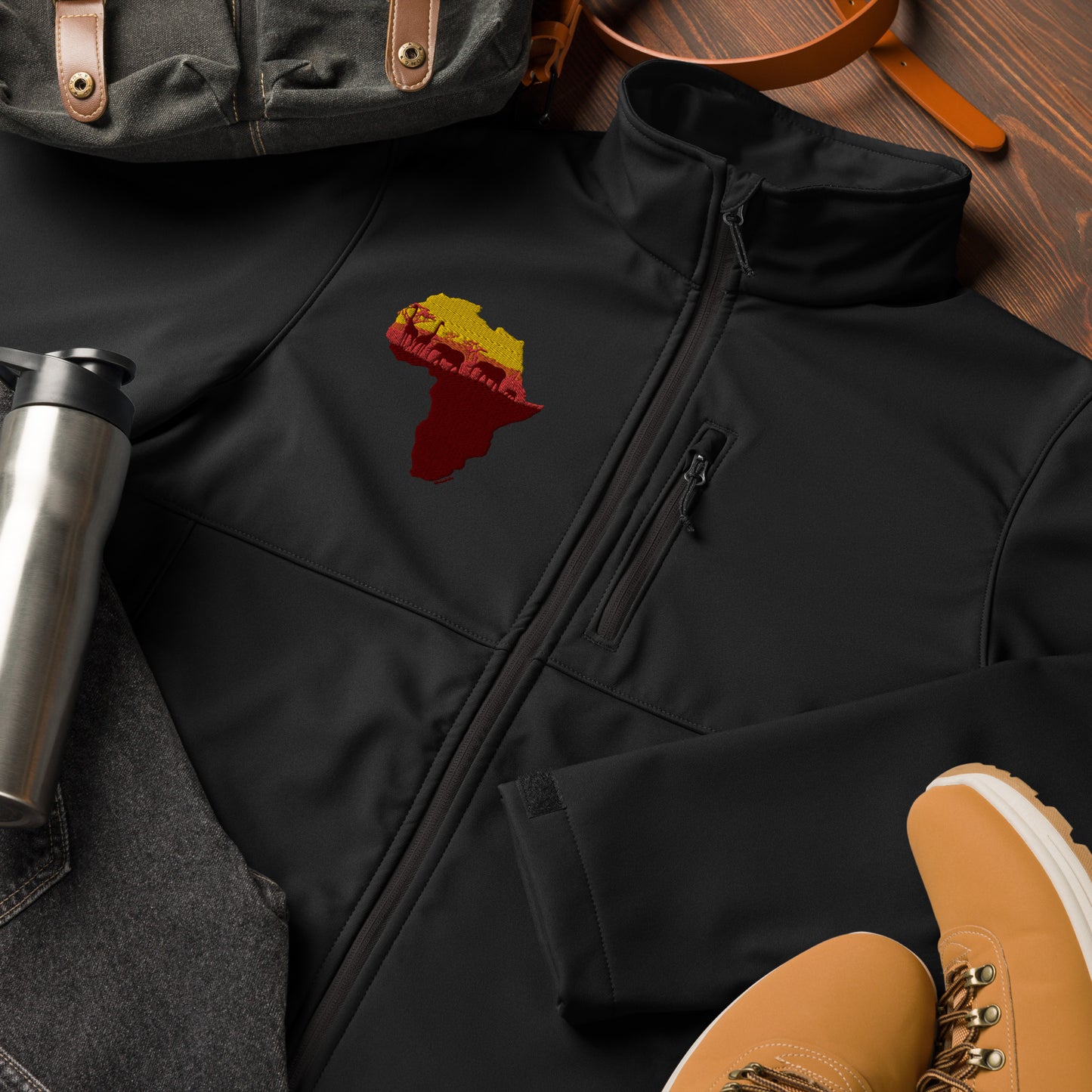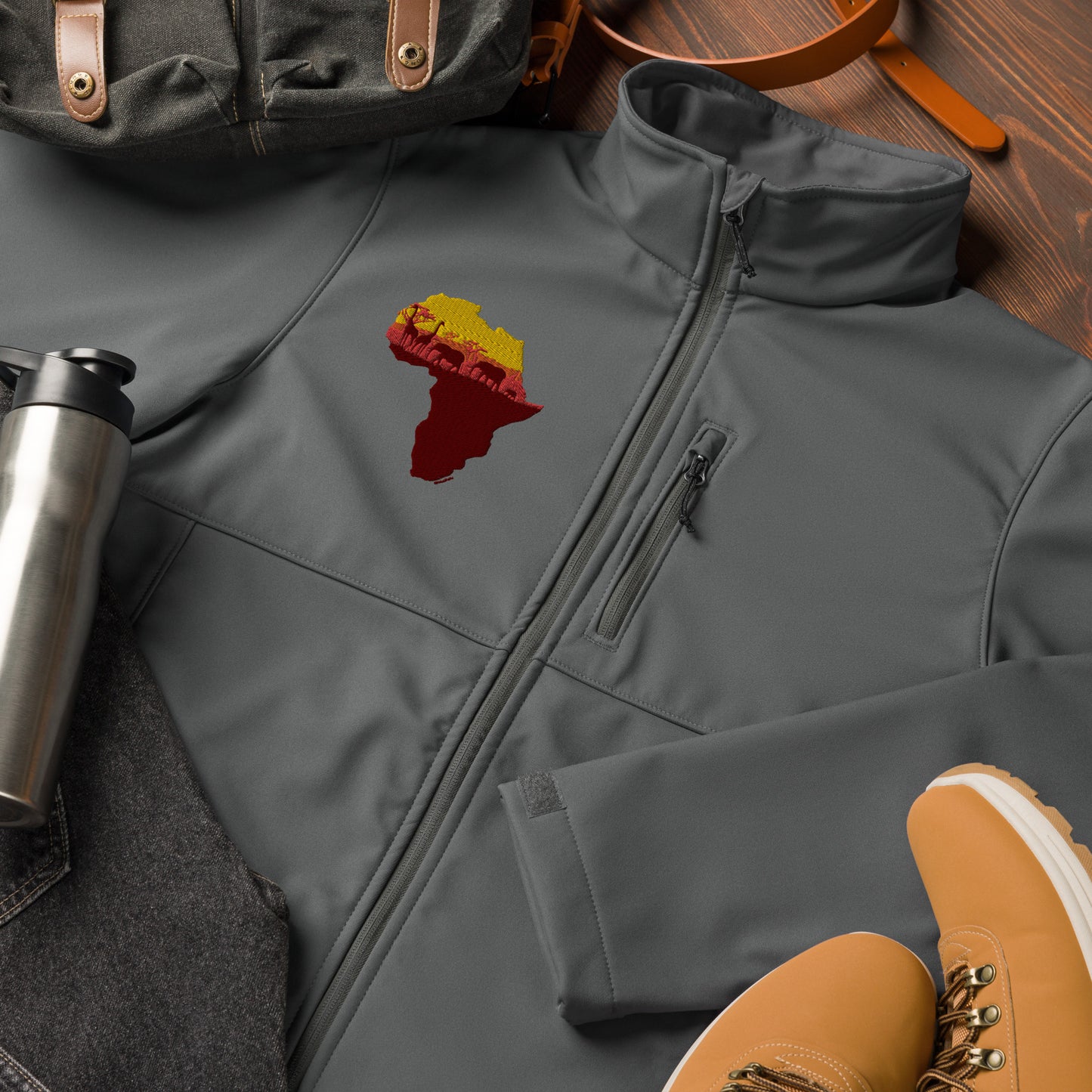 Africa isn't just a place, it's a way being. Tackle any weather with this soft shell jacket. Its wind and water-resistant material will keep you warm and dry during outdoor adventures and everyday use. With zippered pockets and adjustable features, this jacket offers a comfortable fit.