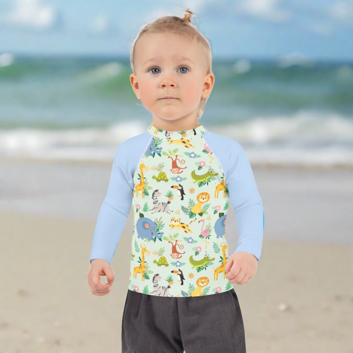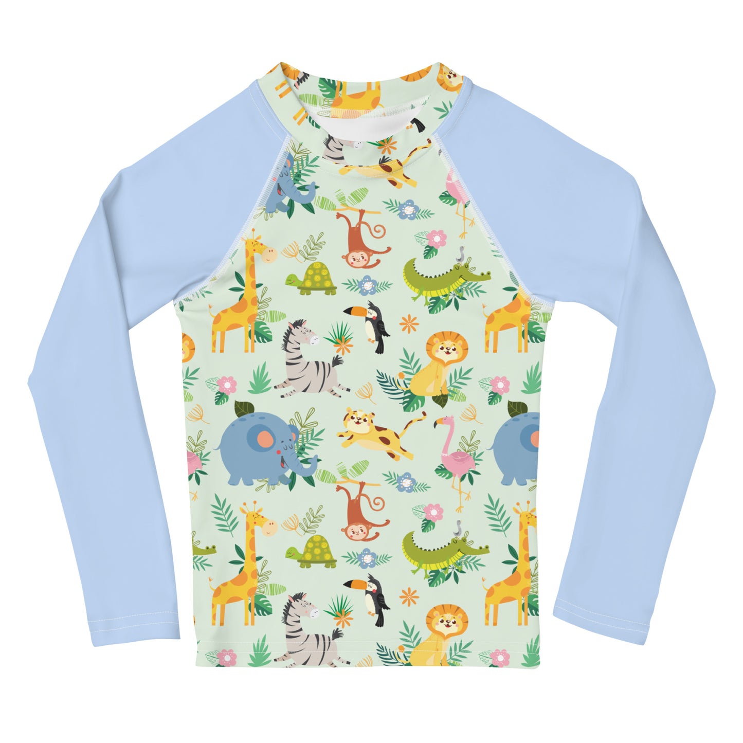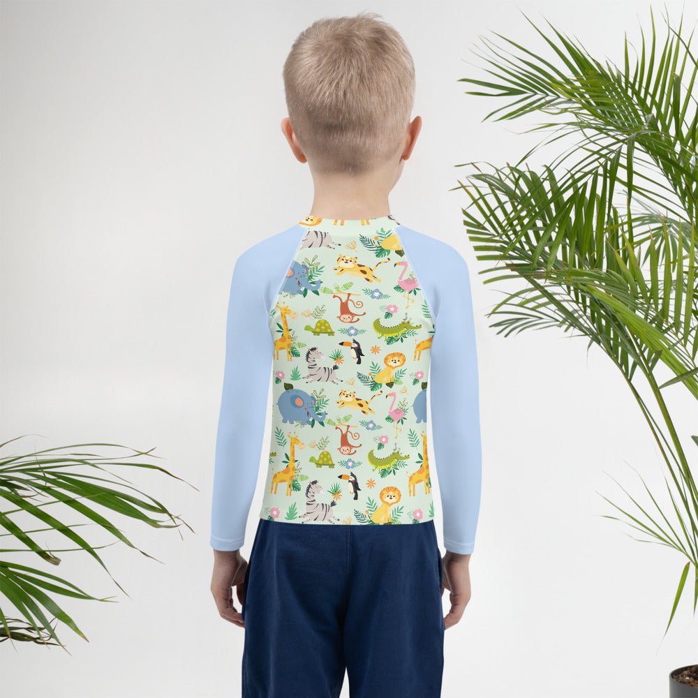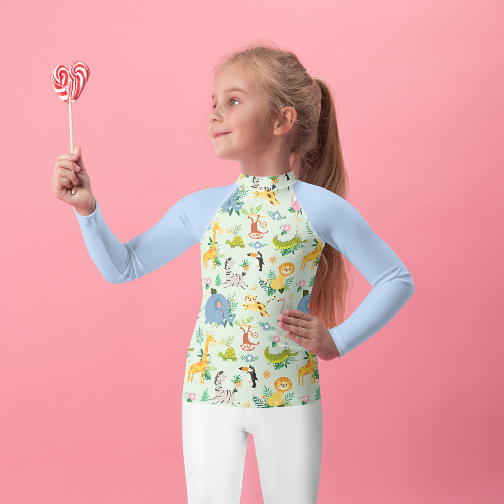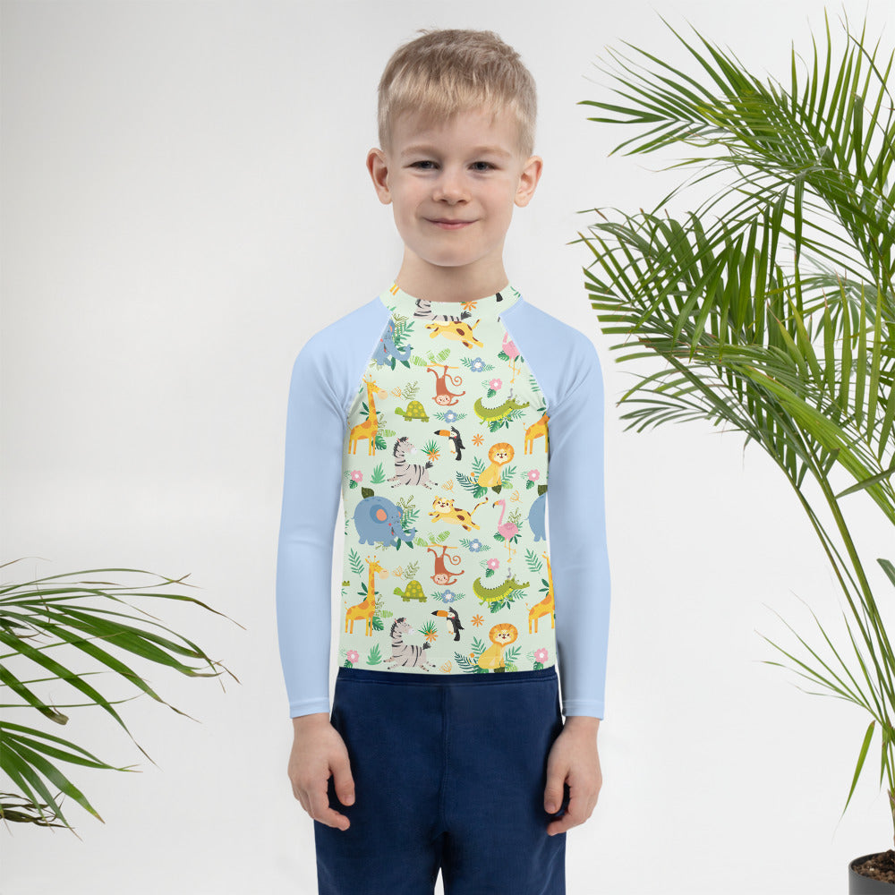 Protect the little ones from the elements with this colorful kids African Animals rash guard. Its sun-protective fabric and long body and sleeves make it perfect for running around on the beach, or just being active indoors.