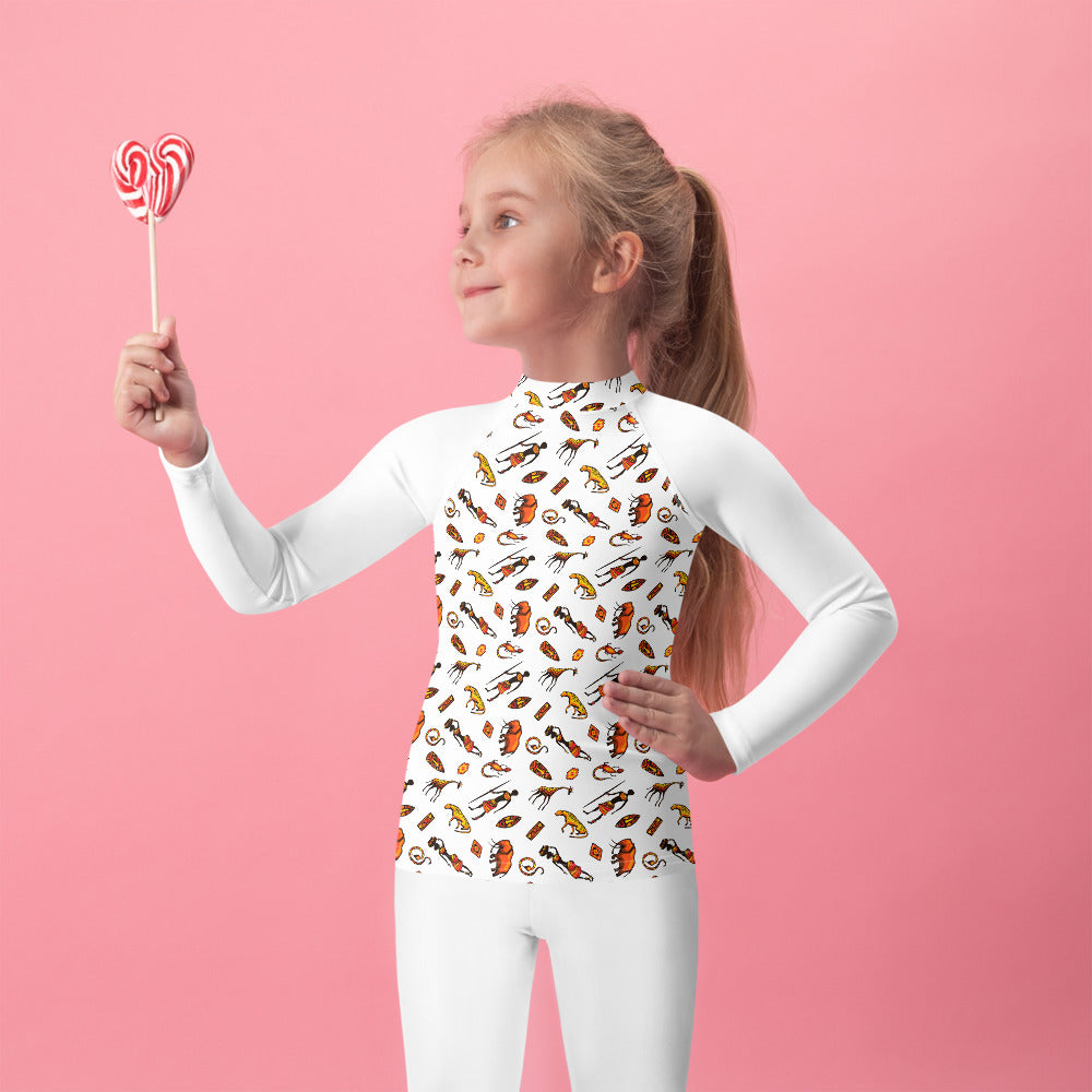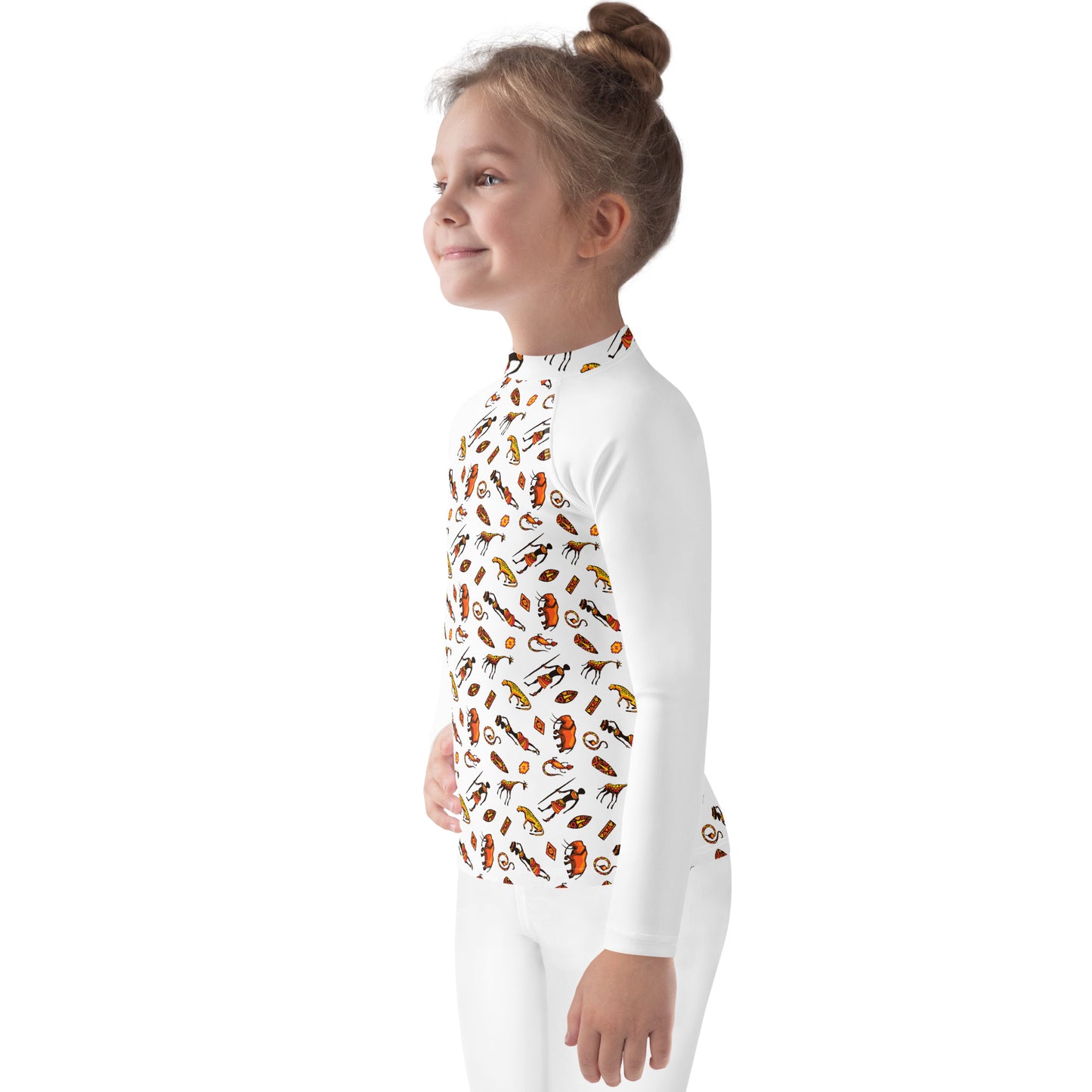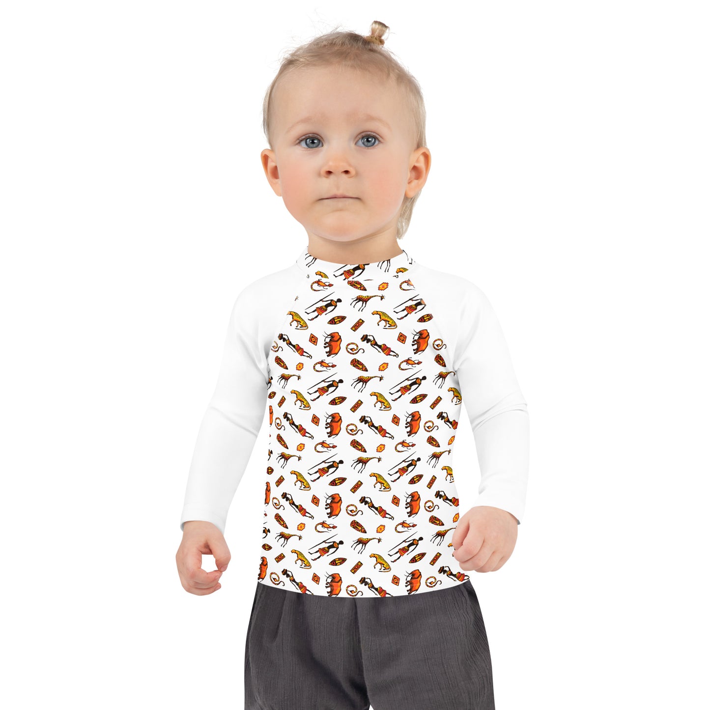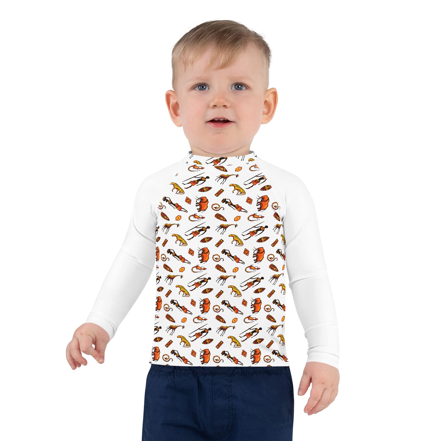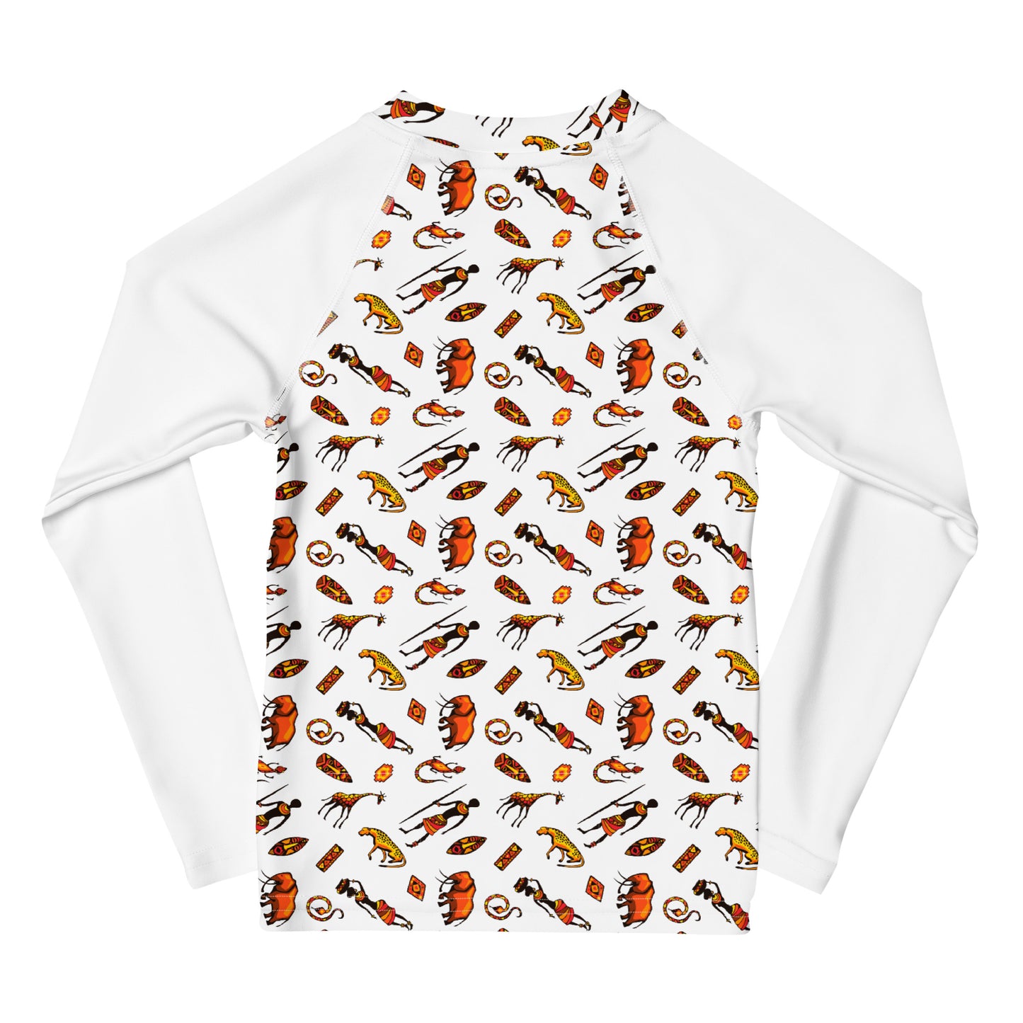 Protect the little ones from the elements with this colorful kids African Bushman & Wildlife rash guard. Its sun-protective fabric and long body and sleeves make it perfect for running around on the beach, or just being active indoors.