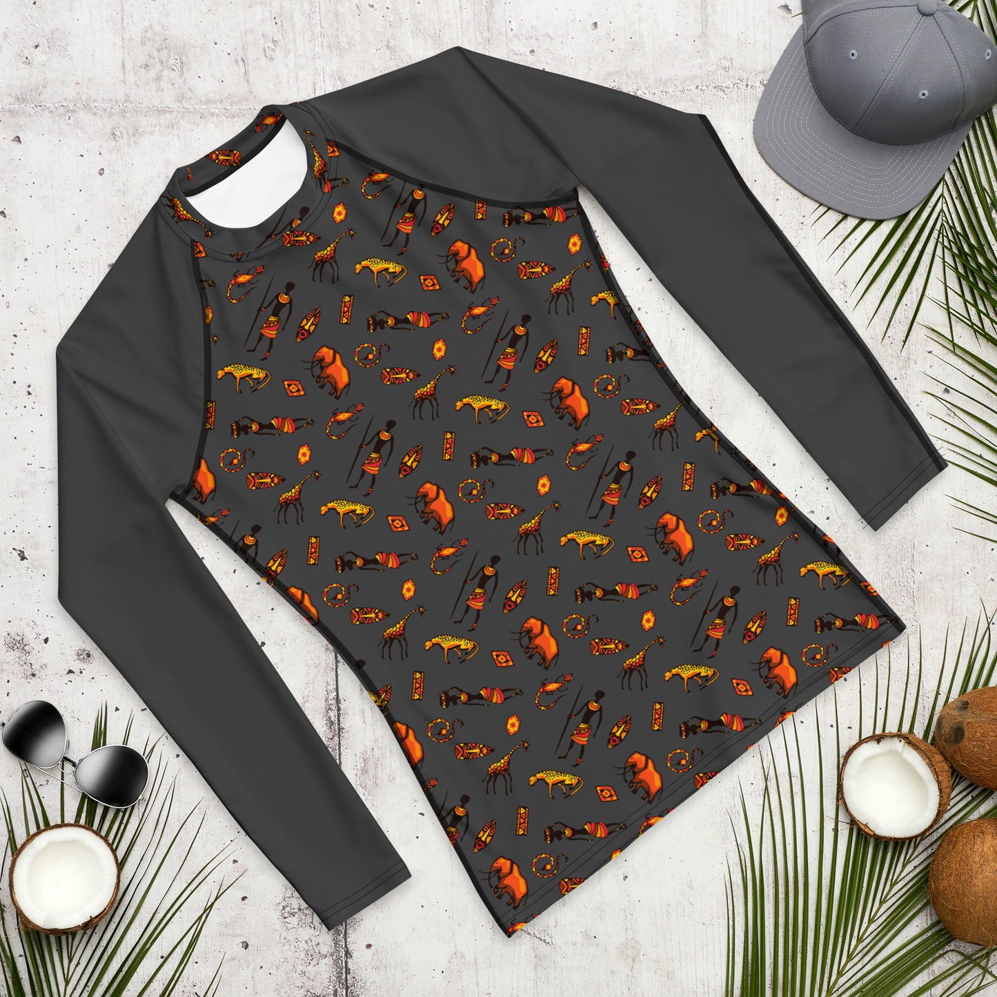 Don’t let sunburn, wind, sand, or other elements ruin your day! This smooth and versatile African Bushman & Wildlife long-sleeve rash guard will protect you while you have fun doing sports. It is slim-fitted with flat ergonomic seams, and a bit longer than your casual tee for extra comfort and protection.