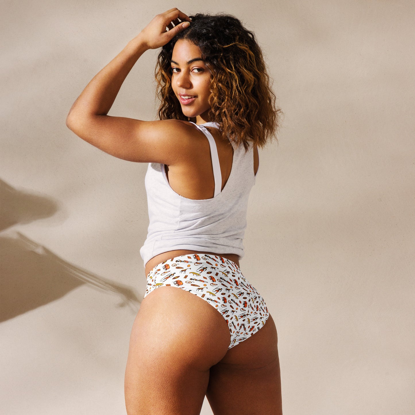 Get this African Bushman & Wildlife Recycled high-waisted bikini bottom and match it with your favorite swimsuit top. It’s comfortable, high-waisted, and double-layered—perfect for an adventurous beach day or a chill spa visit!