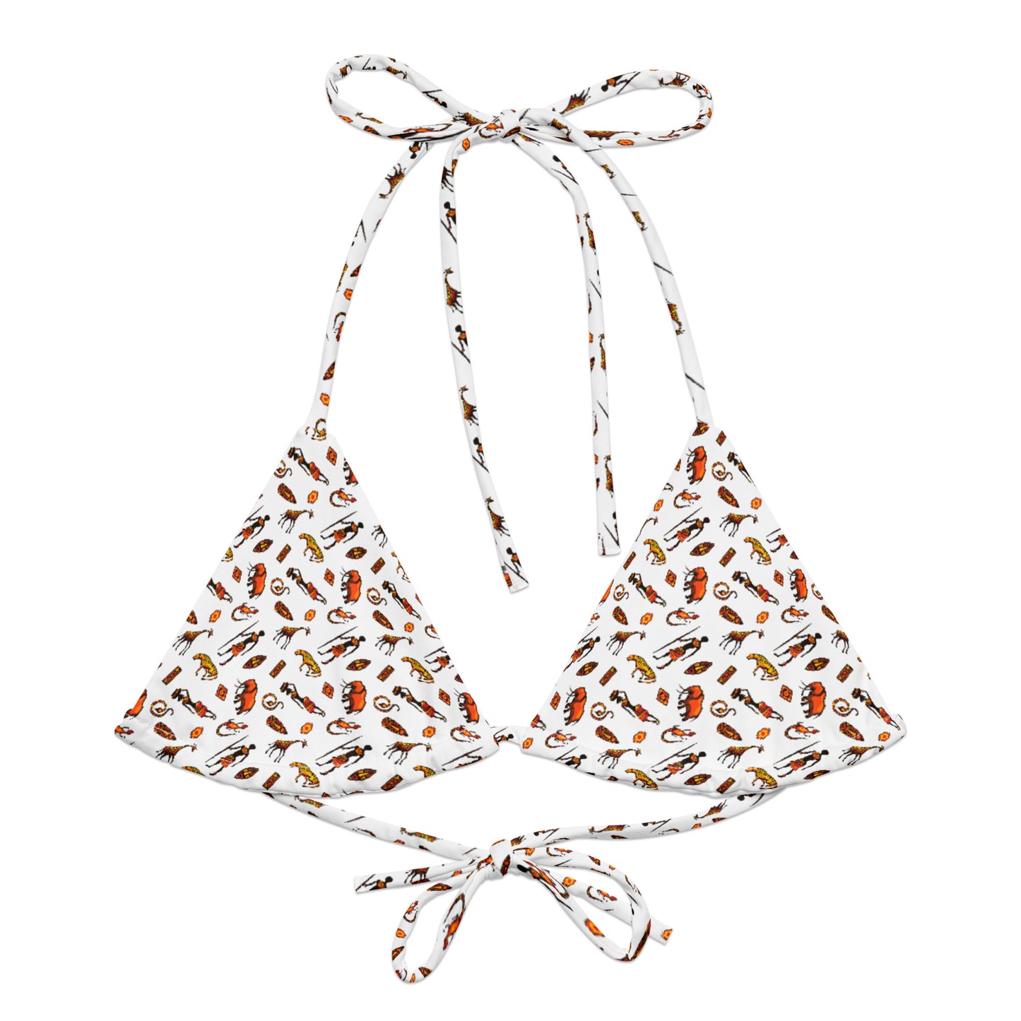 Get ready for the summer season with this eco-friendly All-Over Print Recycled Padded African Bushman & Wildlife String Bikini Top. The top is made from soft recycled polyester, with UPF 50+ and versatile, stretchy straps ready for styling. Grab one today and pair it with a swim-ready outfit.