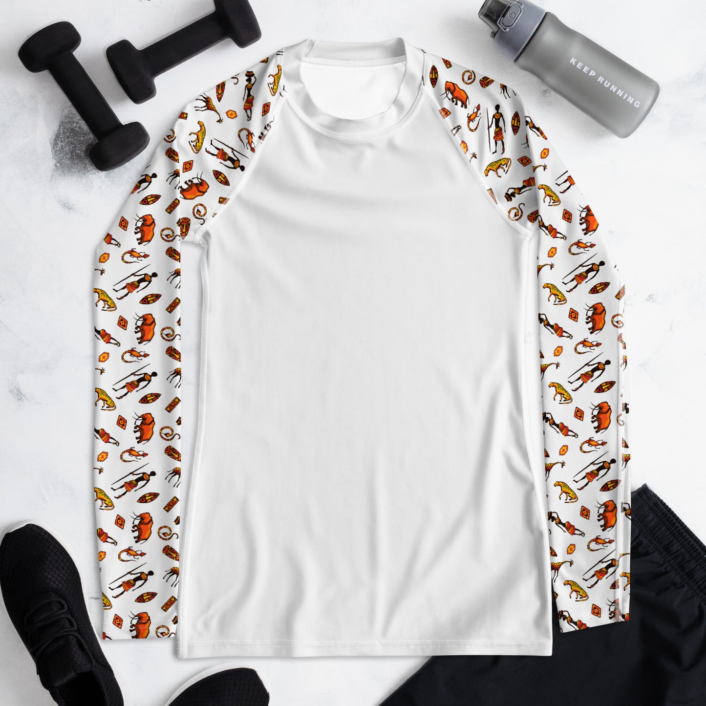 Don't be afraid to be your most active self in this smooth and versatile African Bushman & Wildlife long-sleeve rash guard! It protects you from the sun, wind, and other elements while doing sports, and the slim fit, flat ergonomic seams, and the longer body gives extra comfort.