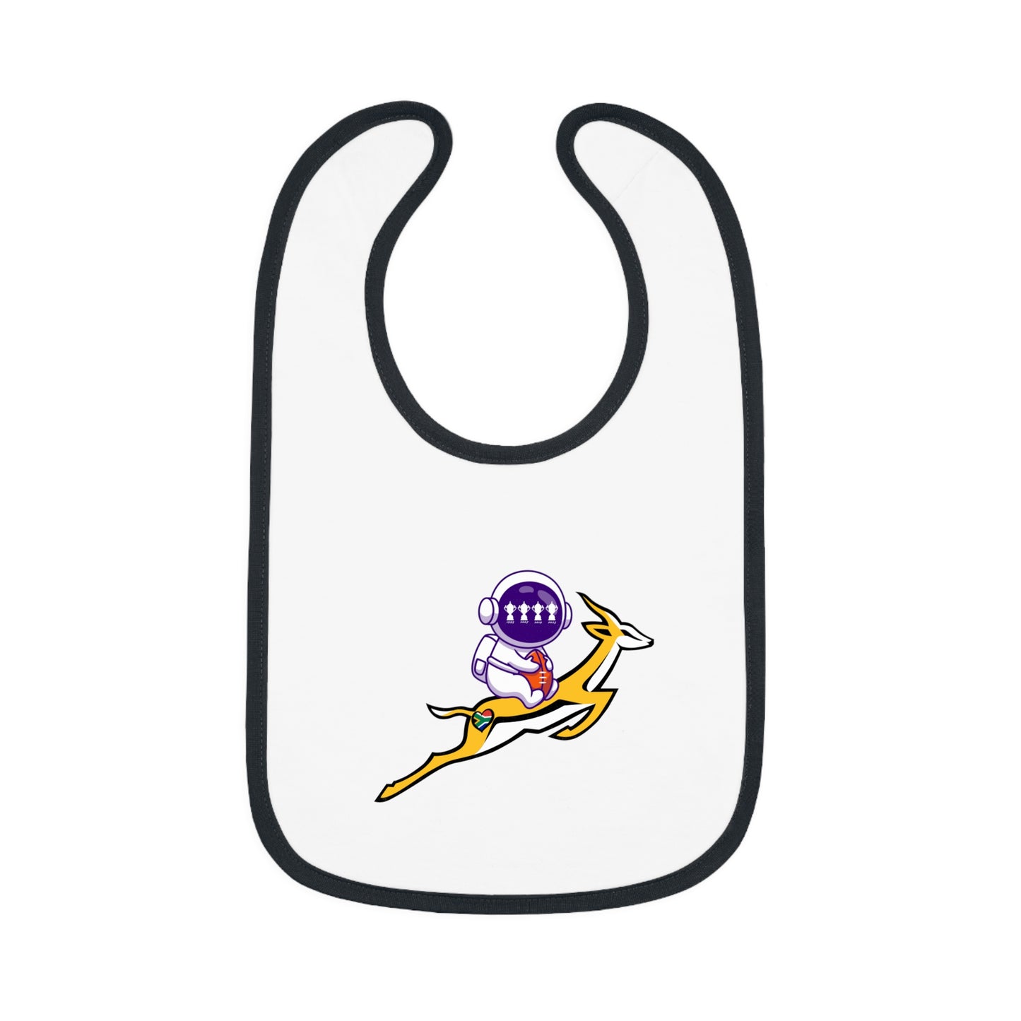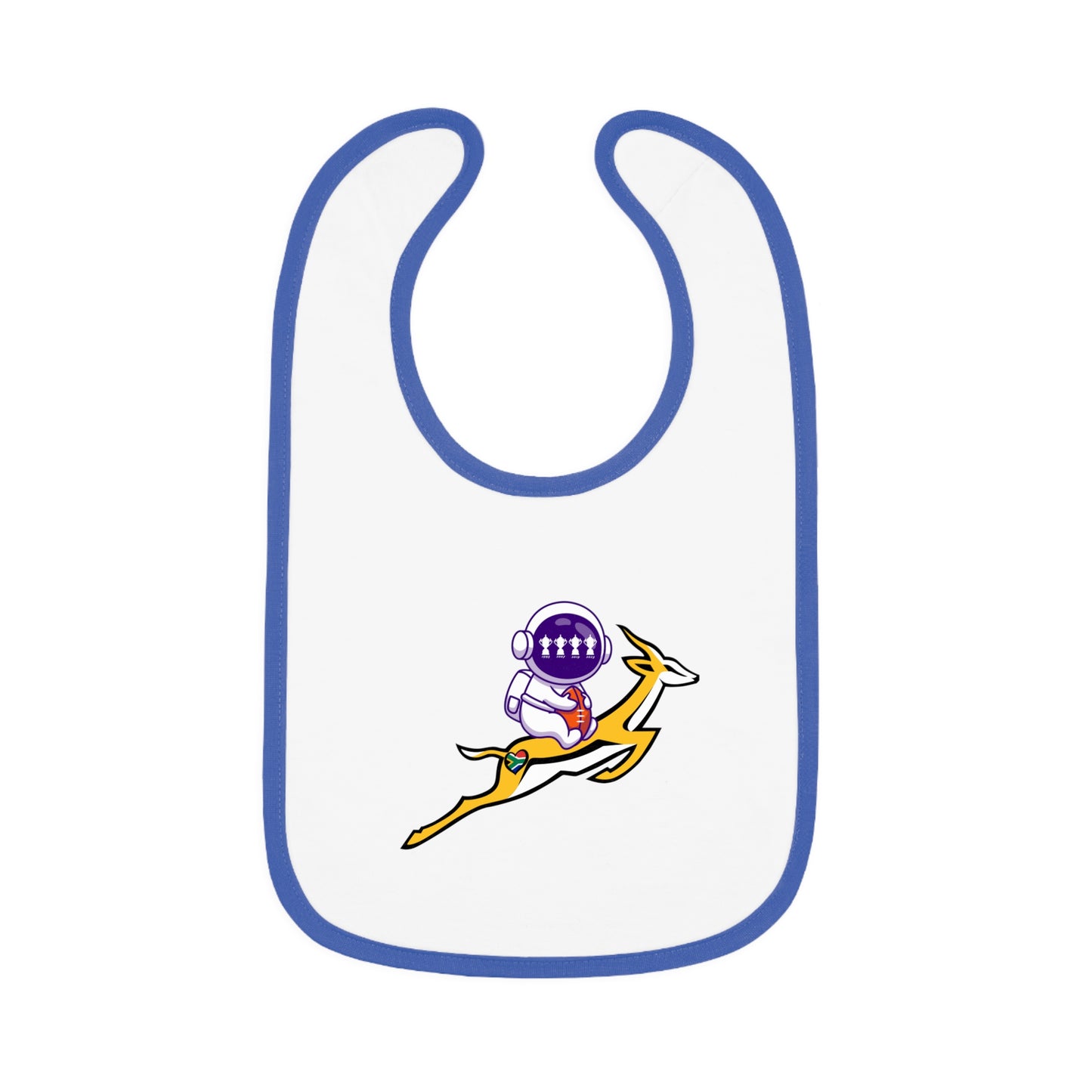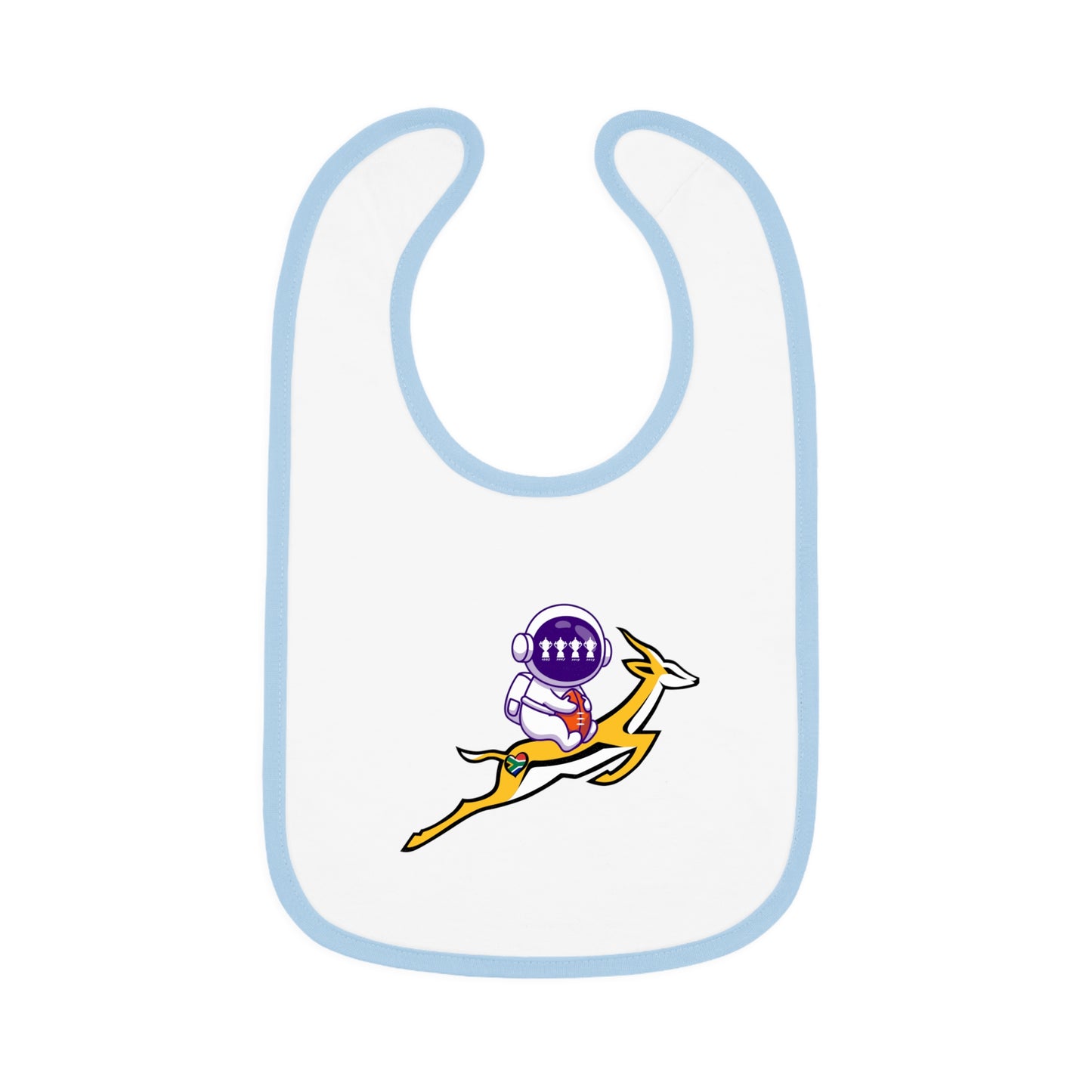 Astrobok Flying - the perfect gift for a mini Springbok Fan! Mealtimes just became more fun with these baby bibs. Featuring a 100% Ring-spun Cotton fabric for delicate softness, an original Velcro® closure for a secure fit during meals, they are as adorable as they are comfy. Plus, the contrast self-fabric binding makes for a seamless look. With an 8” x 9” size, placing your own baby bib pattern makes this product a mom & pop favorite.
