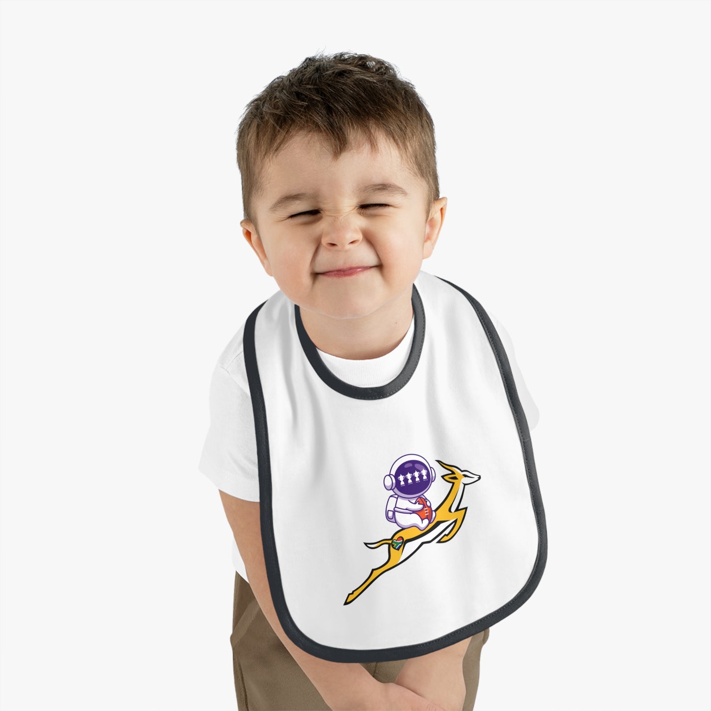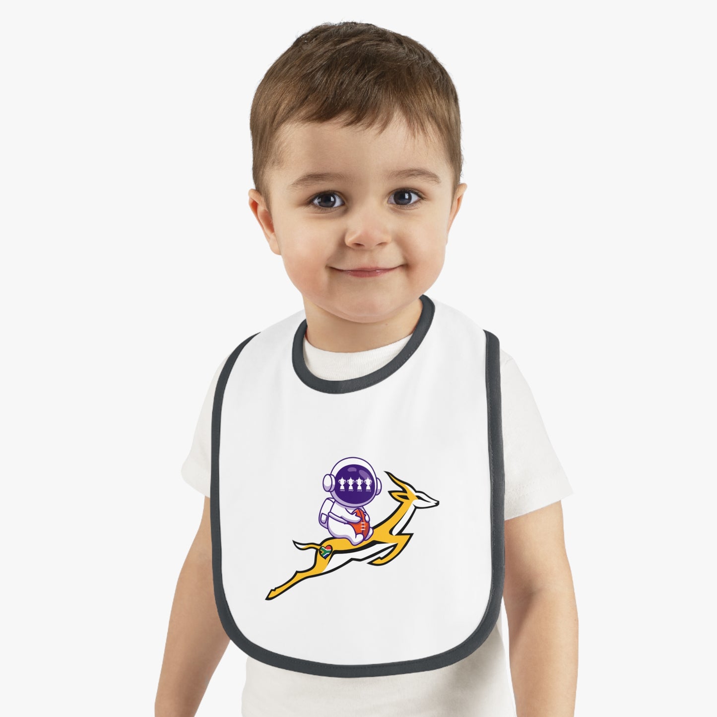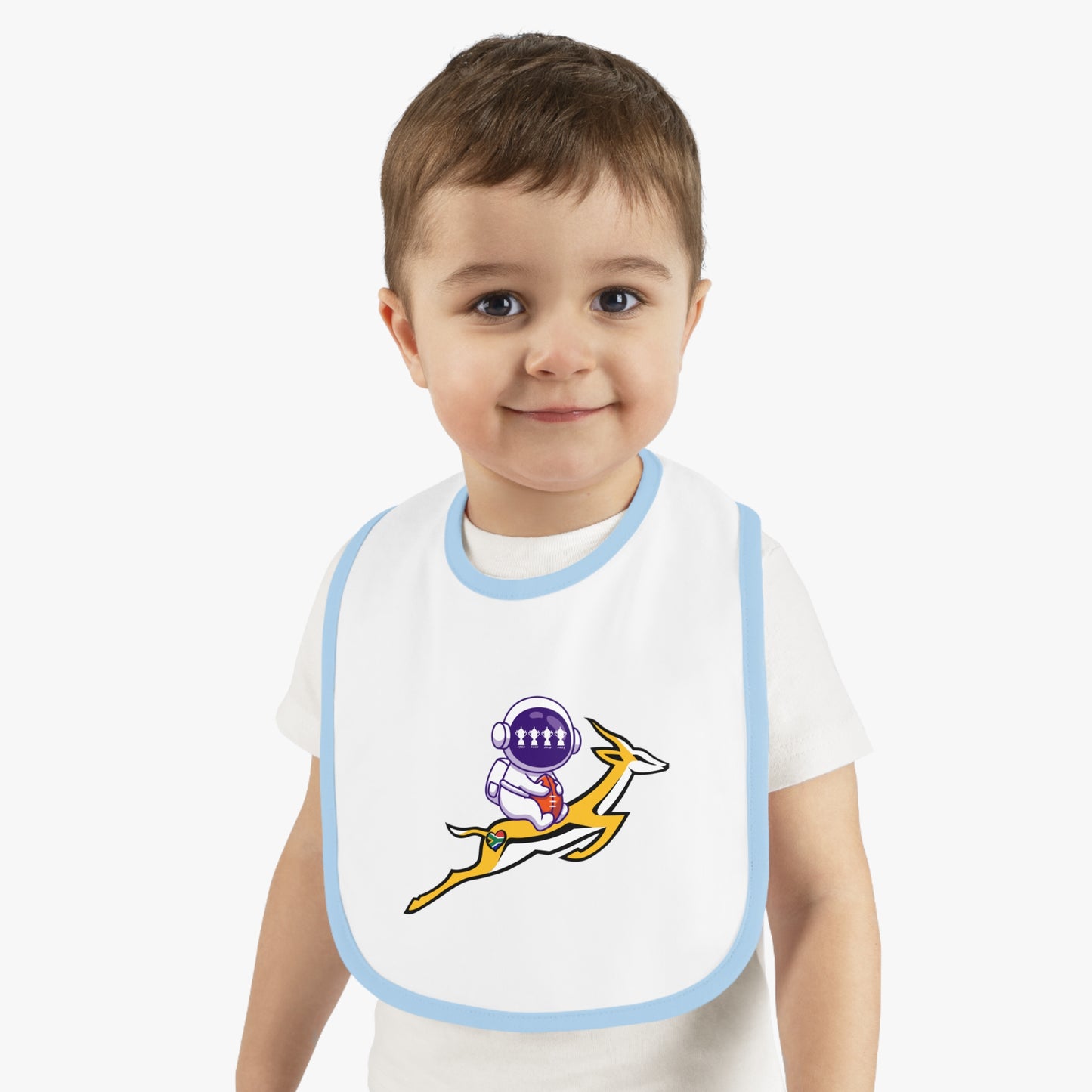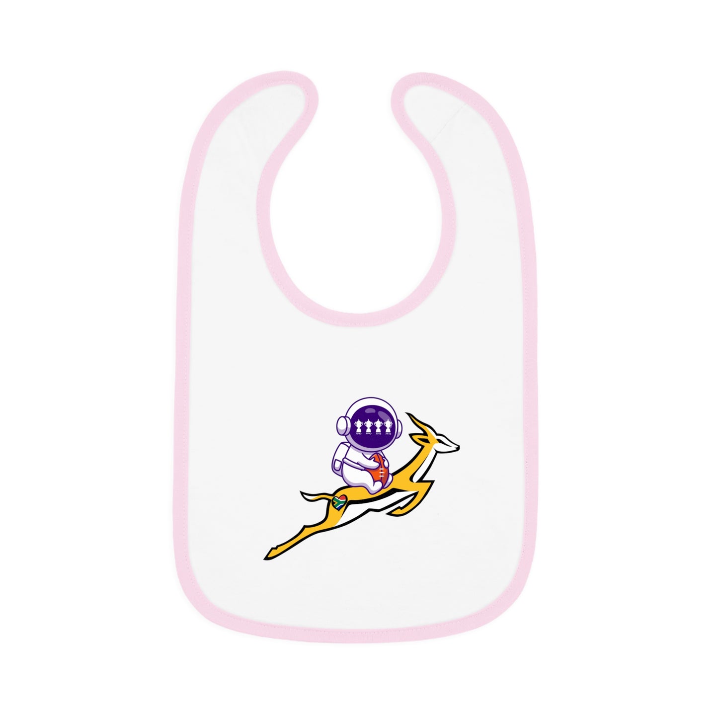 Astrobok Flying - the perfect gift for a mini Springbok Fan! Mealtimes just became more fun with these baby bibs. Featuring a 100% Ring-spun Cotton fabric for delicate softness, an original Velcro® closure for a secure fit during meals, they are as adorable as they are comfy. Plus, the contrast self-fabric binding makes for a seamless look. With an 8” x 9” size, placing your own baby bib pattern makes this product a mom & pop favorite.