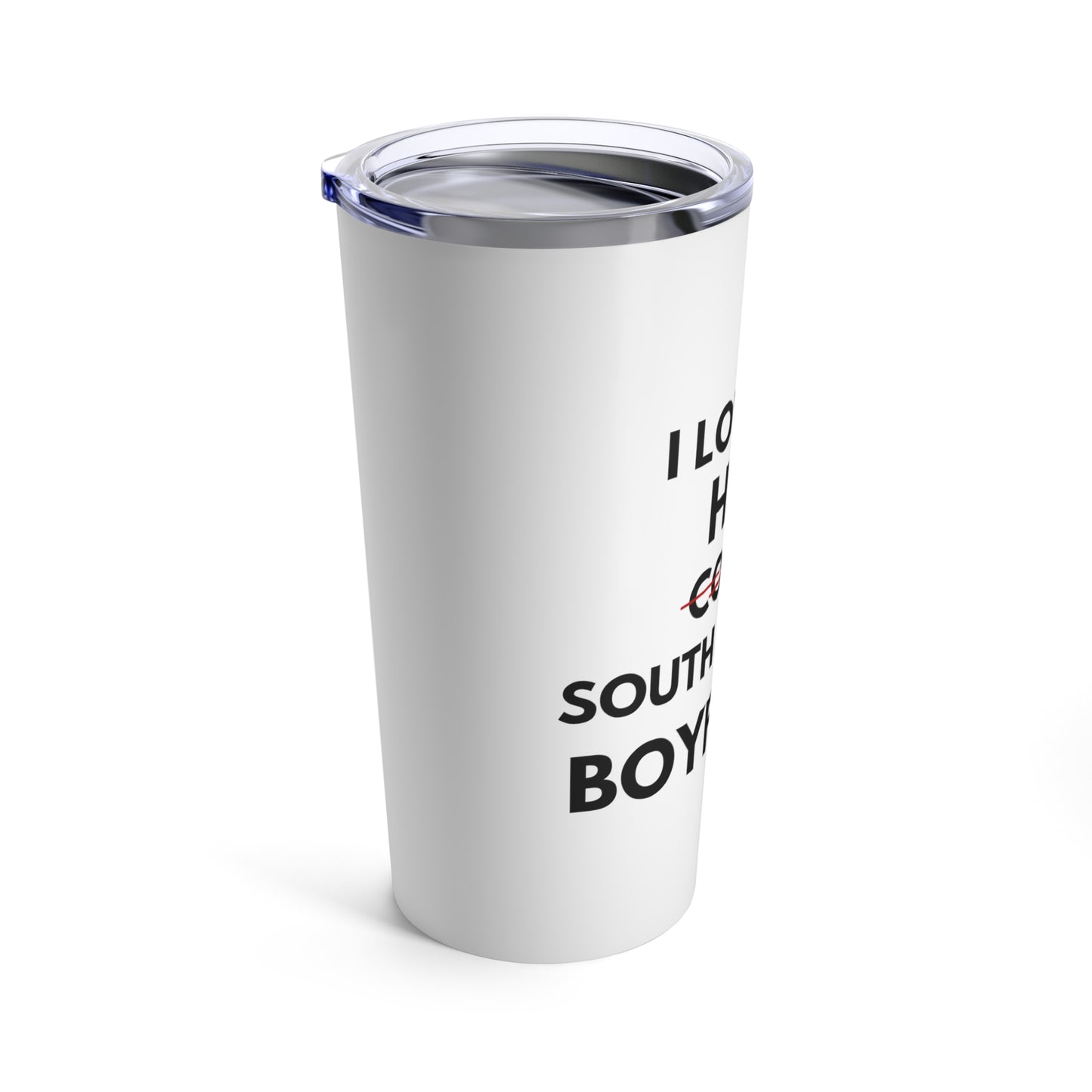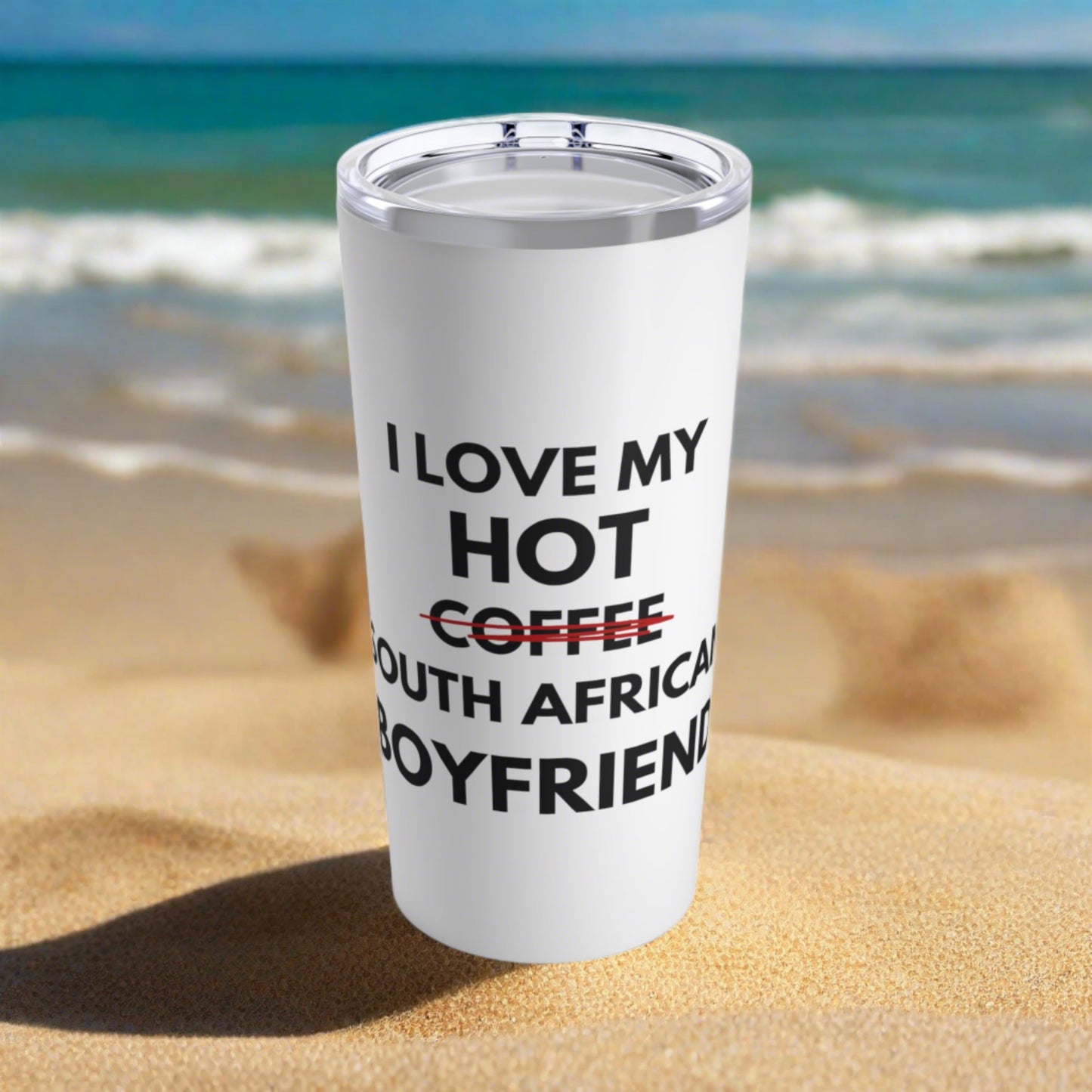 Tongue in cheek... The "I love my hot coffee ahem I mean South African Boyfriend" stainless travel-size tumbler is vacuum-insulated and built to last. It's perfect for showing off your style on the road, at the office, or in the countryside.