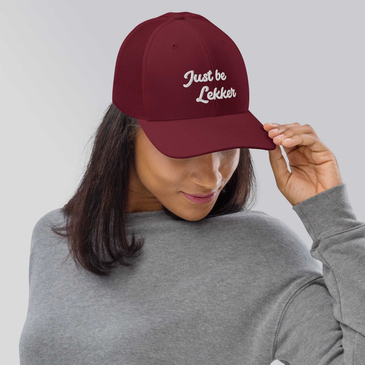 Complete your outfit with an embroidered trucker cap with an all time important message "Just be lekker" (Just be nice) —combine it with a sports tee, slacks, and comfy shoes. It has a classic structured fit, adjustable plastic snapback, and a curved visor that matches its underbill.