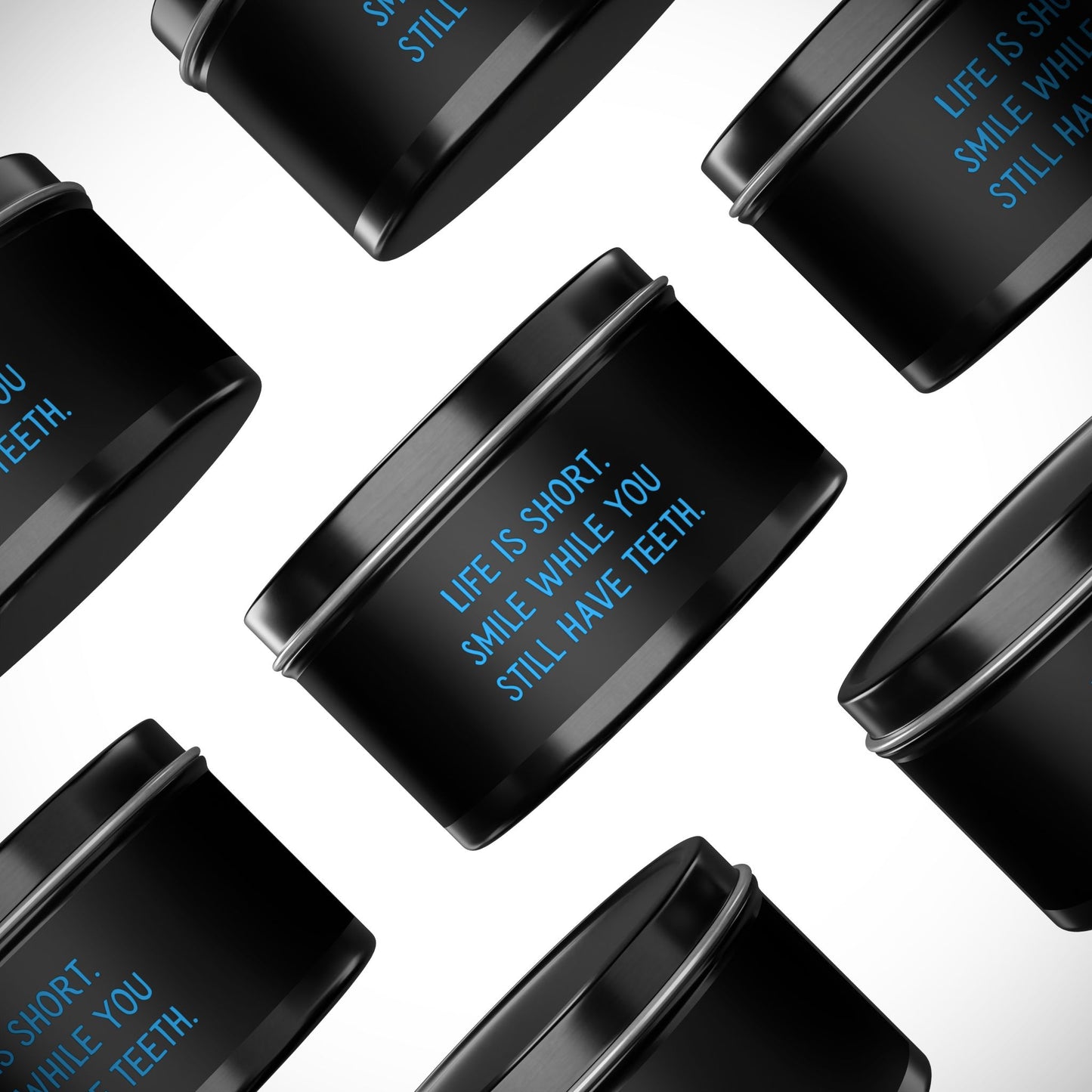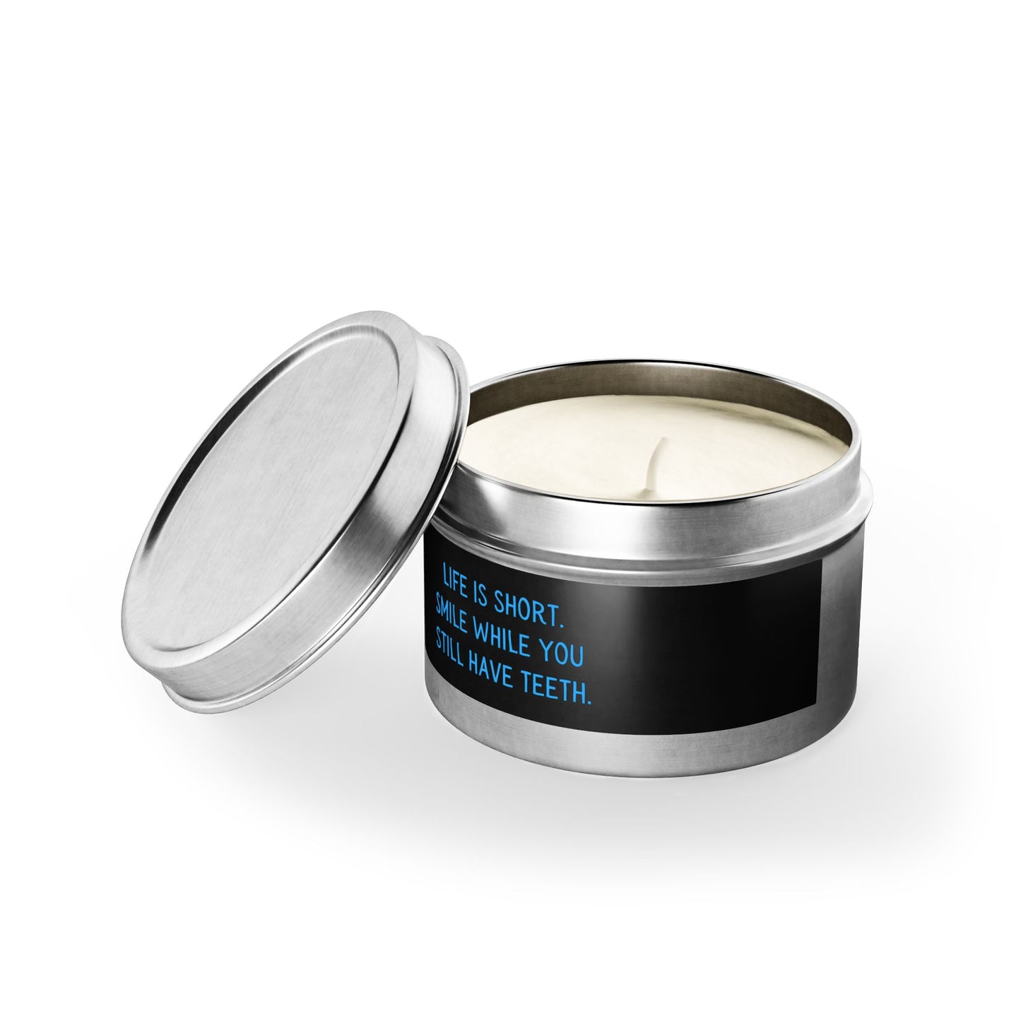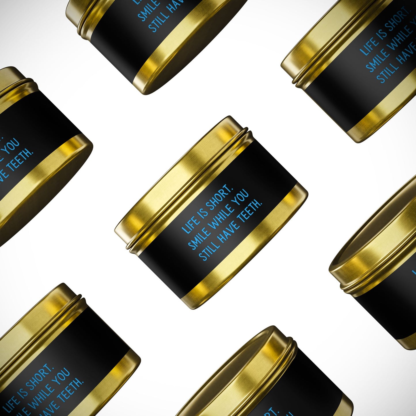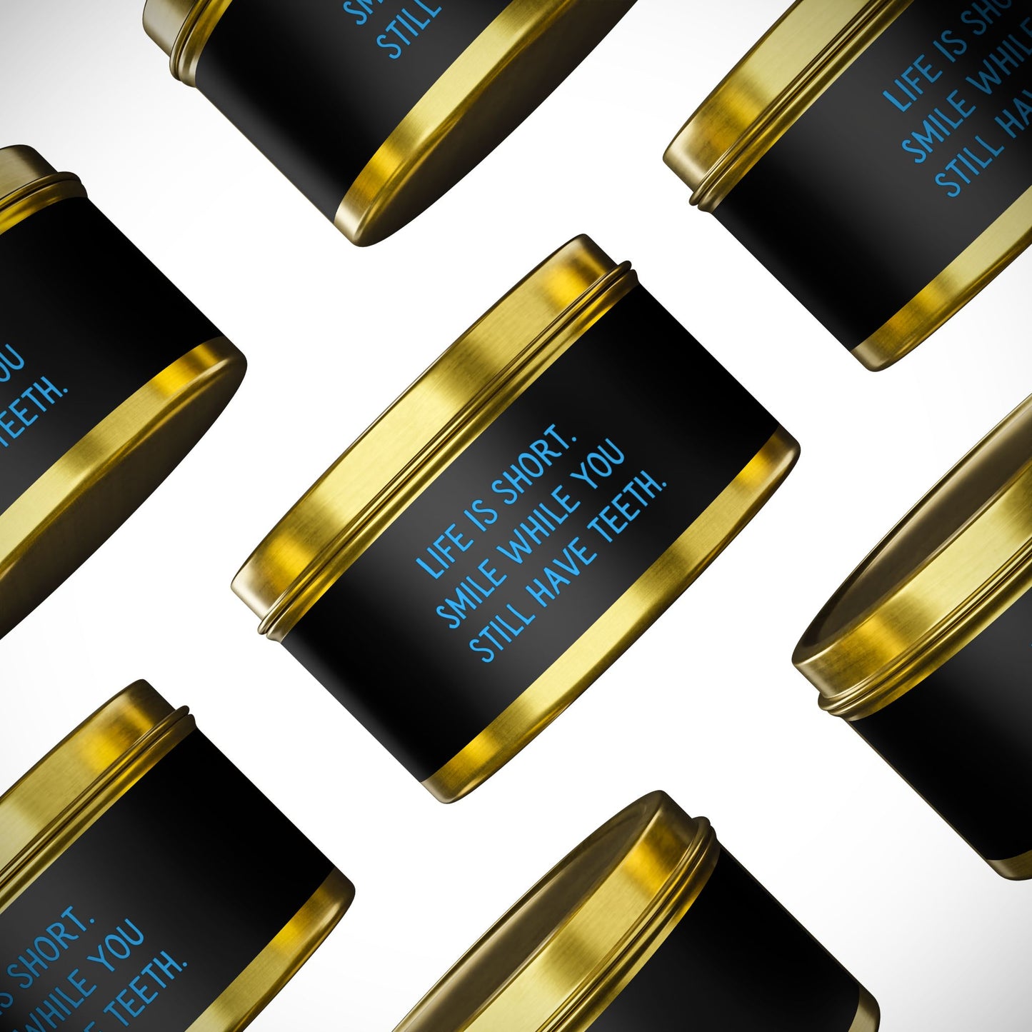 Create a treat for aromatherapy enthusiasts with these Life is Short. Smile while you still have teeth tin candles. Available in 4oz and 8oz tins, these candles come natural coconut soy wax that is made and hand-poured in the USA. All candles feature a lead and zinc-free cotton wick with an average burning time of 20 hours (4oz) and 40h (8oz). Choose between 5 captivating aromas: evergreen, fresh coffee, mango coconut, spa retreat, or vanilla bean, and 3 tin colors: gold, silver, or black.