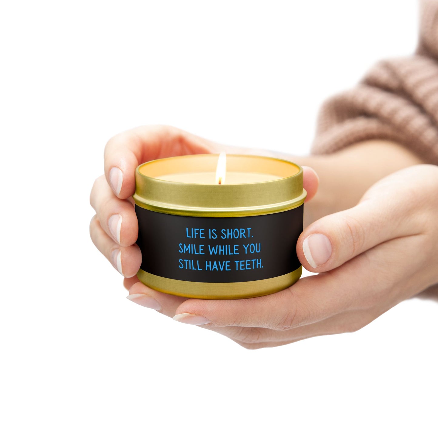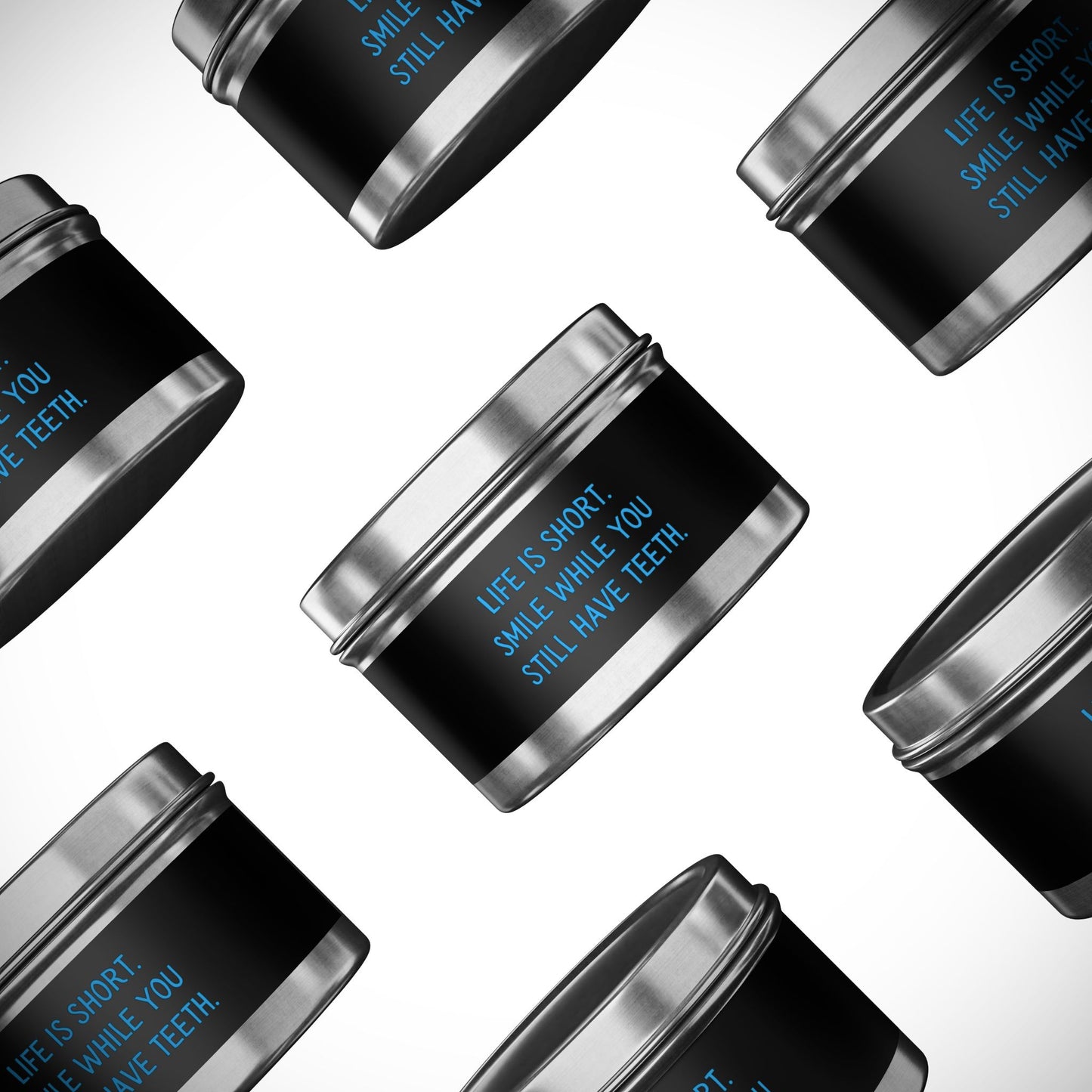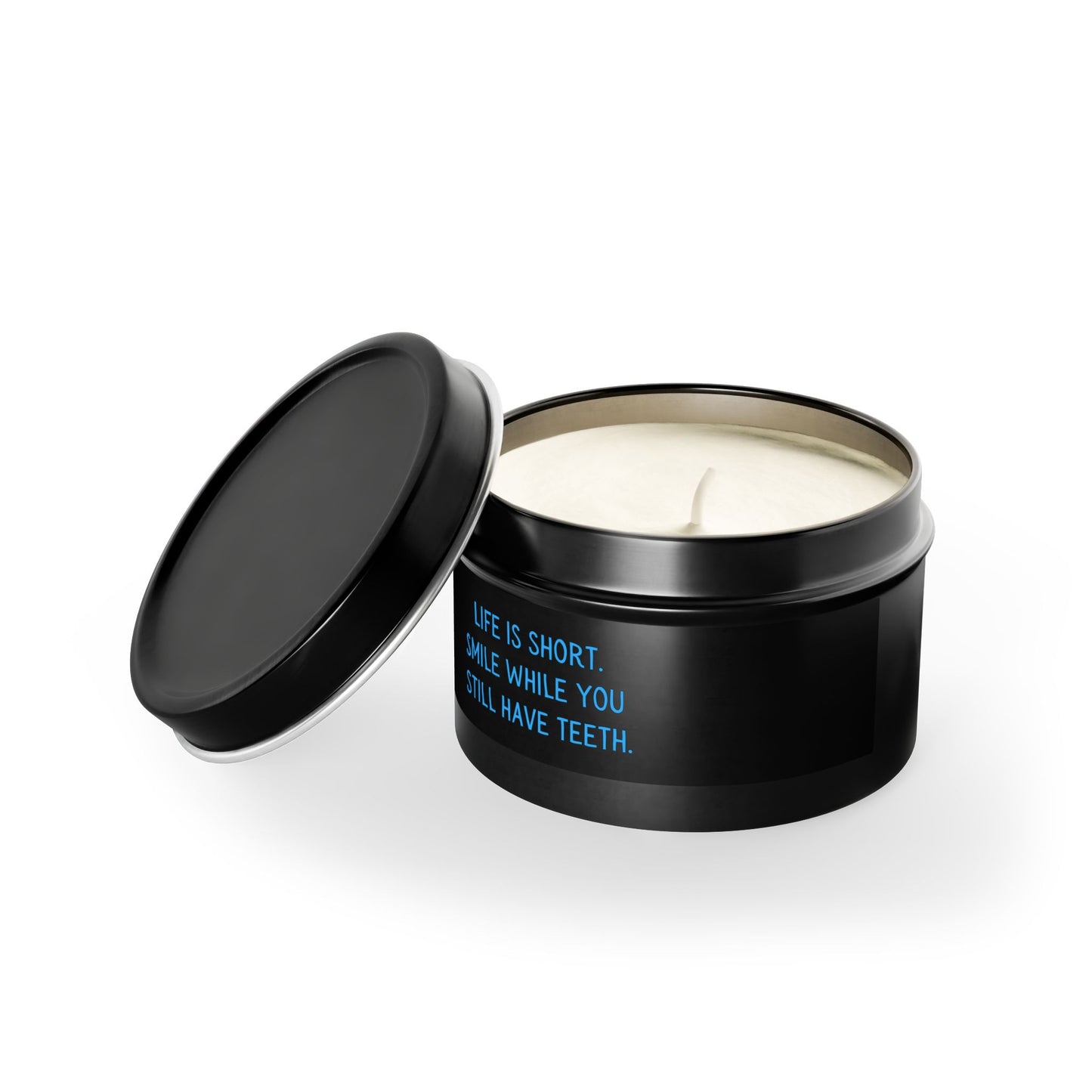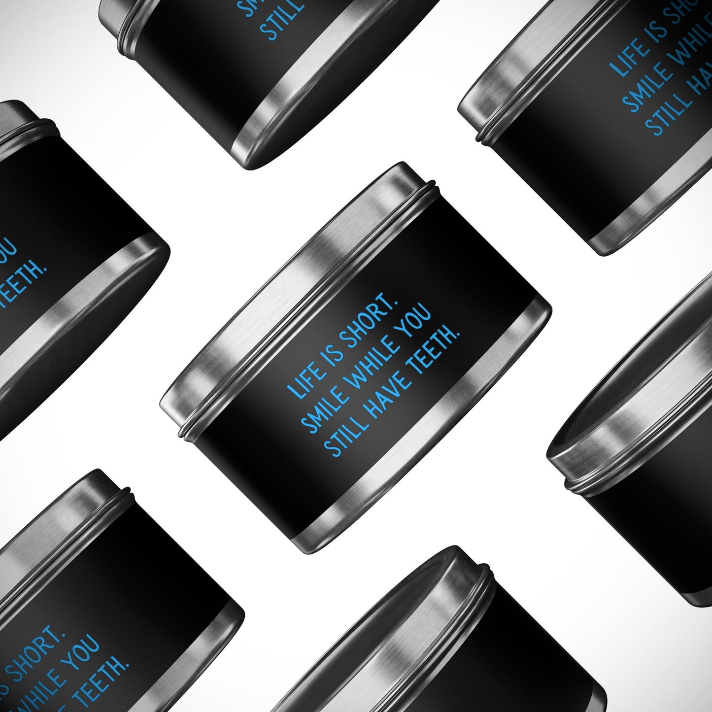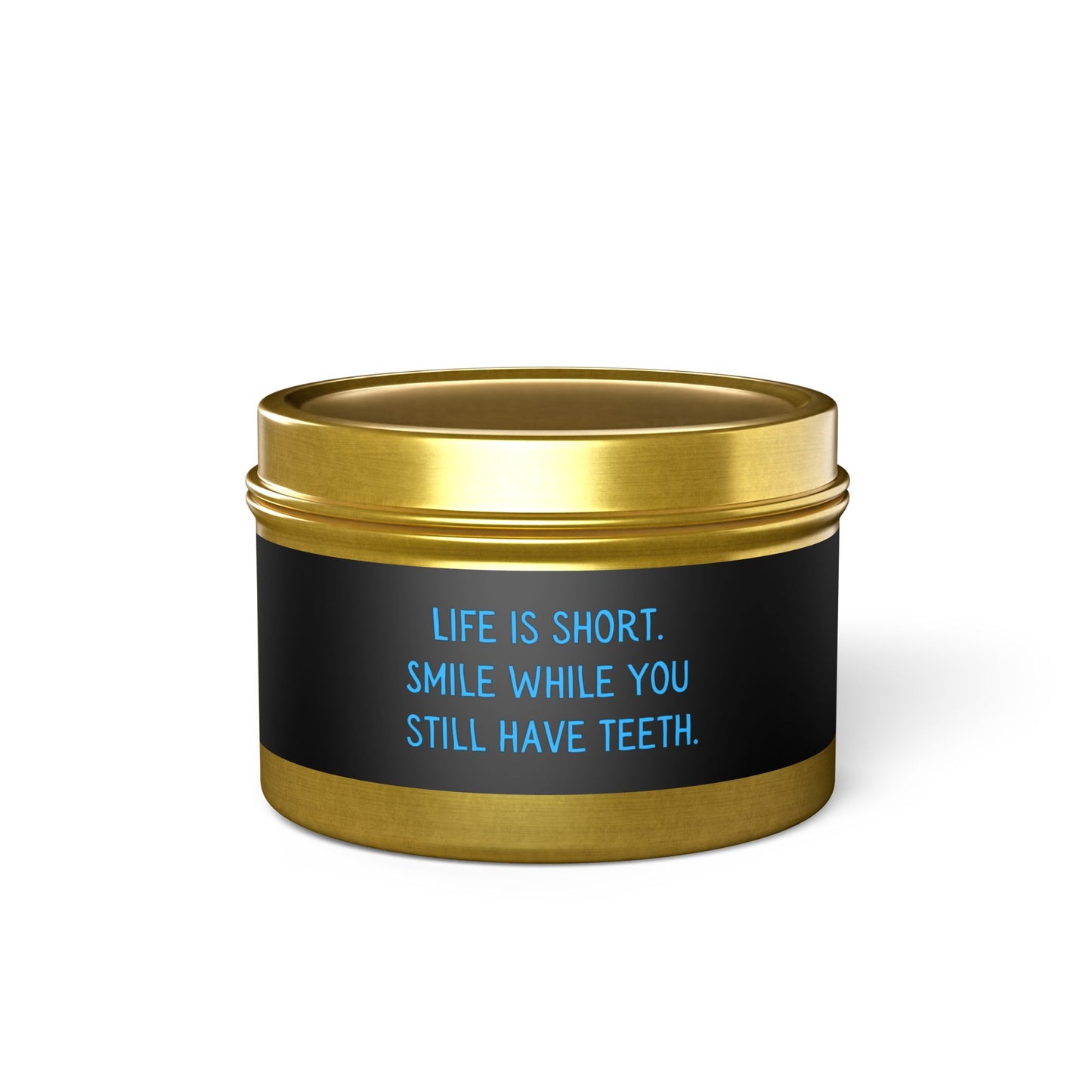 Create a treat for aromatherapy enthusiasts with these Life is Short. Smile while you still have teeth tin candles. Available in 4oz and 8oz tins, these candles come natural coconut soy wax that is made and hand-poured in the USA. All candles feature a lead and zinc-free cotton wick with an average burning time of 20 hours (4oz) and 40h (8oz). Choose between 5 captivating aromas: evergreen, fresh coffee, mango coconut, spa retreat, or vanilla bean, and 3 tin colors: gold, silver, or black.