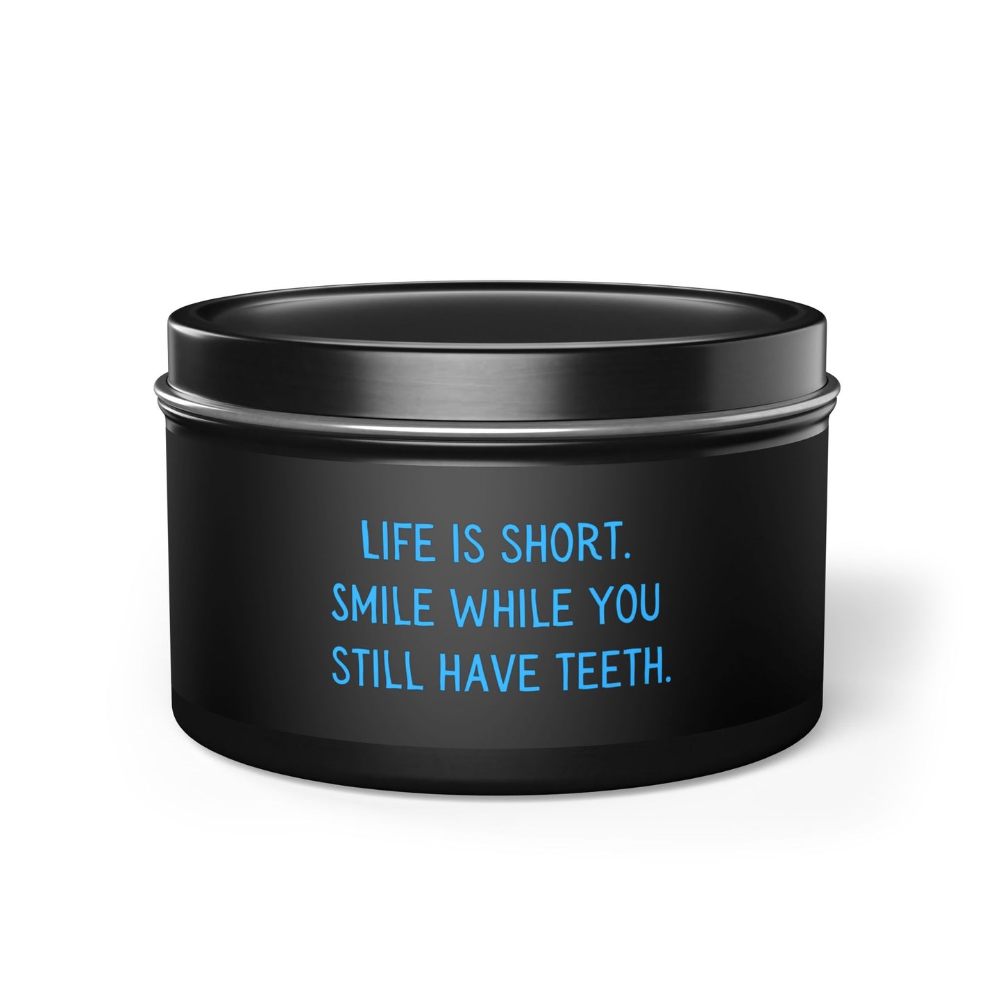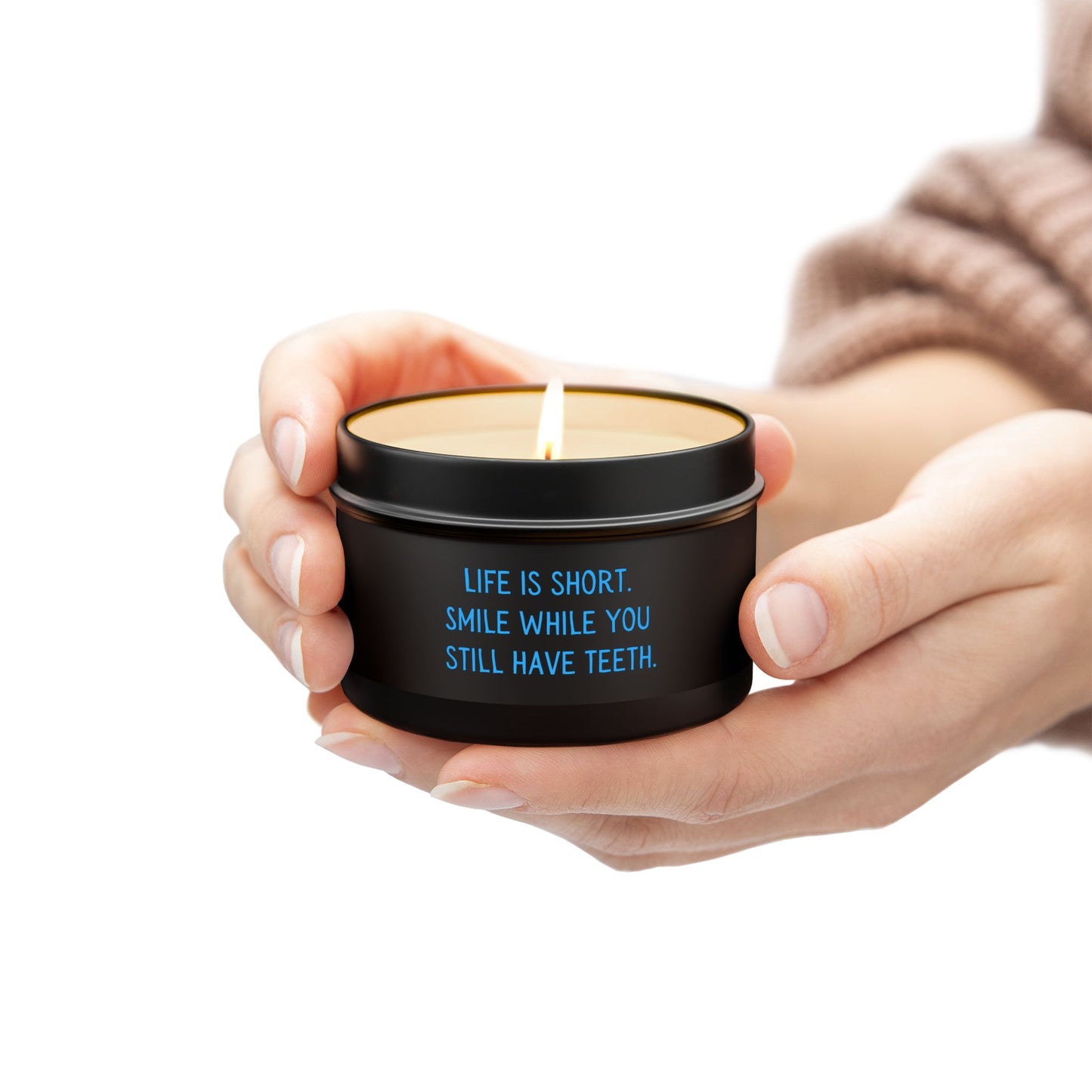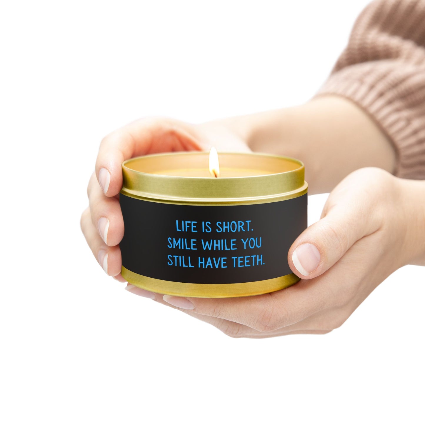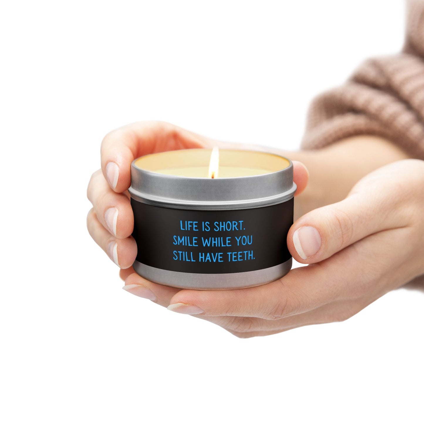 Create a treat for aromatherapy enthusiasts with these Life is Short. Smile while you still have teeth tin candles. Available in 4oz and 8oz tins, these candles come natural coconut soy wax that is made and hand-poured in the USA. All candles feature a lead and zinc-free cotton wick with an average burning time of 20 hours (4oz) and 40h (8oz). Choose between 5 captivating aromas: evergreen, fresh coffee, mango coconut, spa retreat, or vanilla bean, and 3 tin colors: gold, silver, or black.