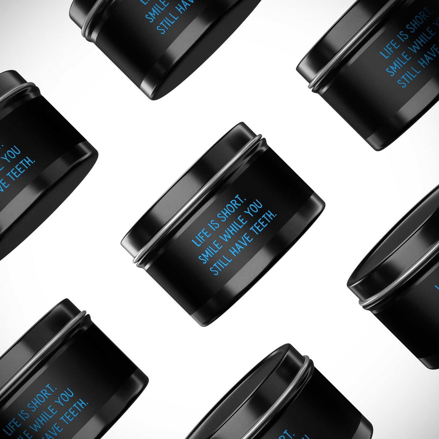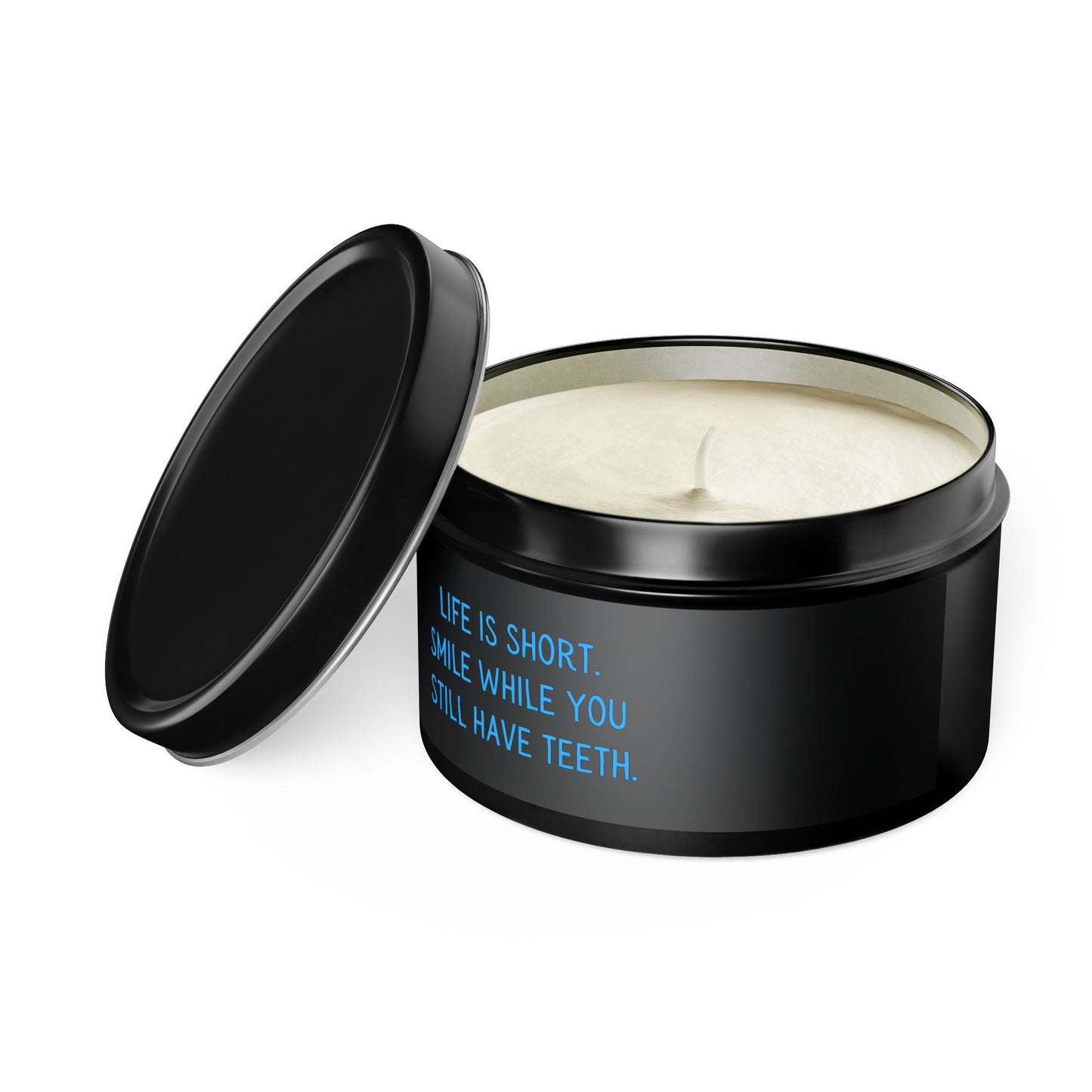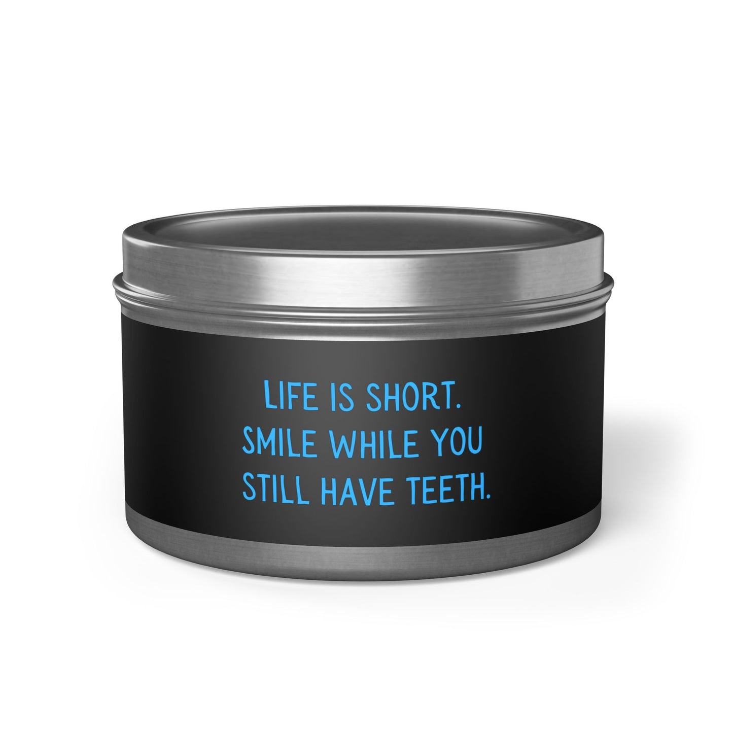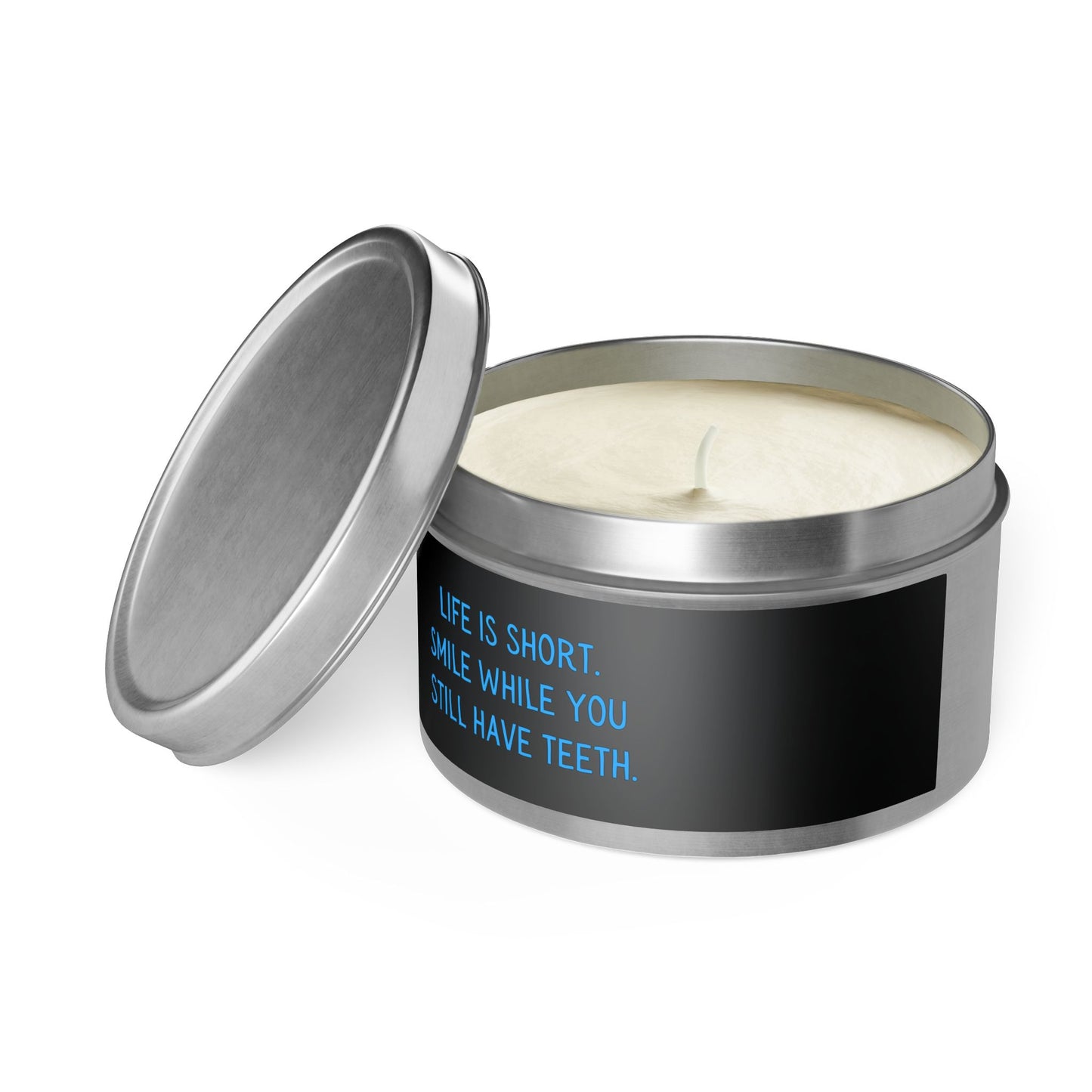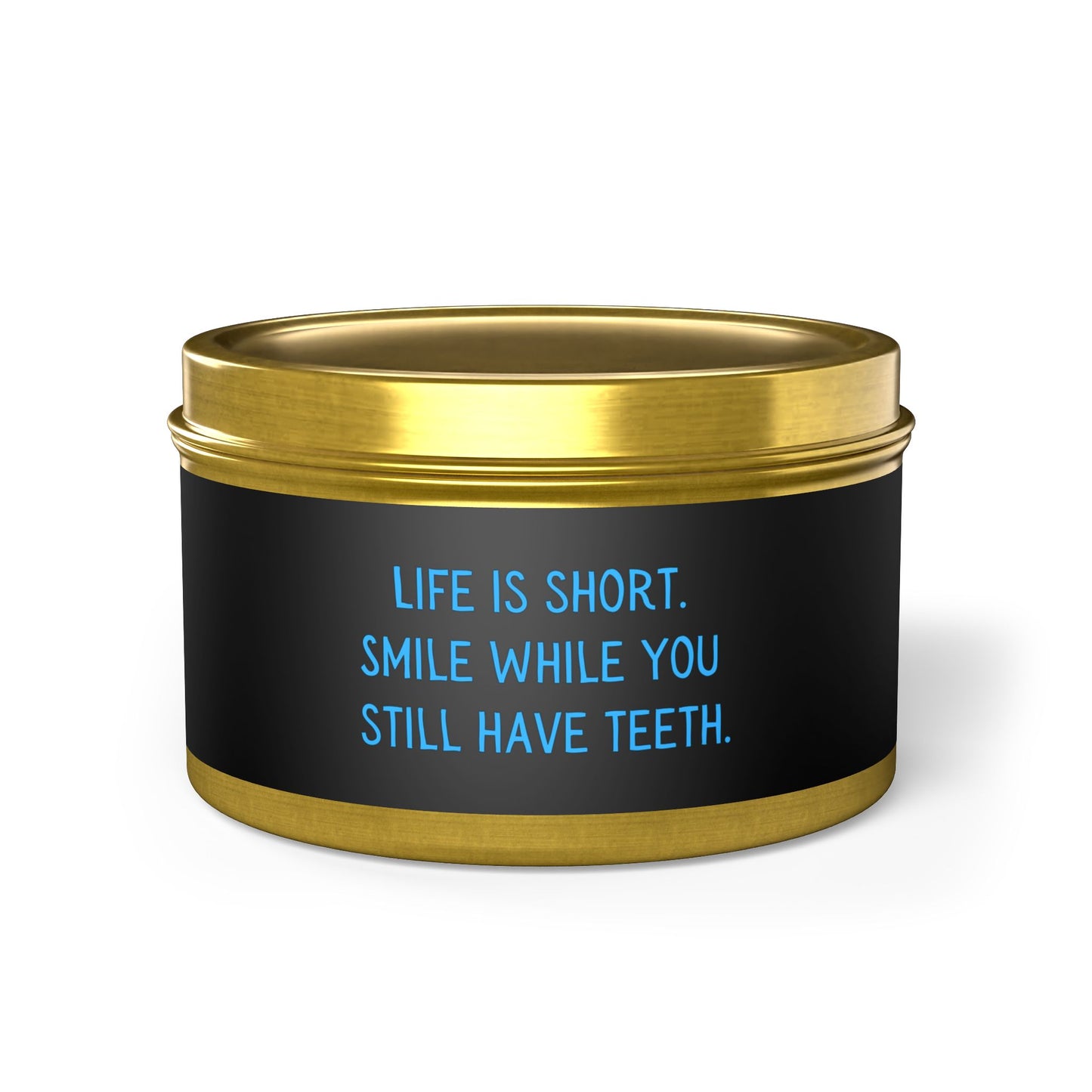 Create a treat for aromatherapy enthusiasts with these Life is Short. Smile while you still have teeth tin candles. Available in 4oz and 8oz tins, these candles come natural coconut soy wax that is made and hand-poured in the USA. All candles feature a lead and zinc-free cotton wick with an average burning time of 20 hours (4oz) and 40h (8oz). Choose between 5 captivating aromas: evergreen, fresh coffee, mango coconut, spa retreat, or vanilla bean, and 3 tin colors: gold, silver, or black.