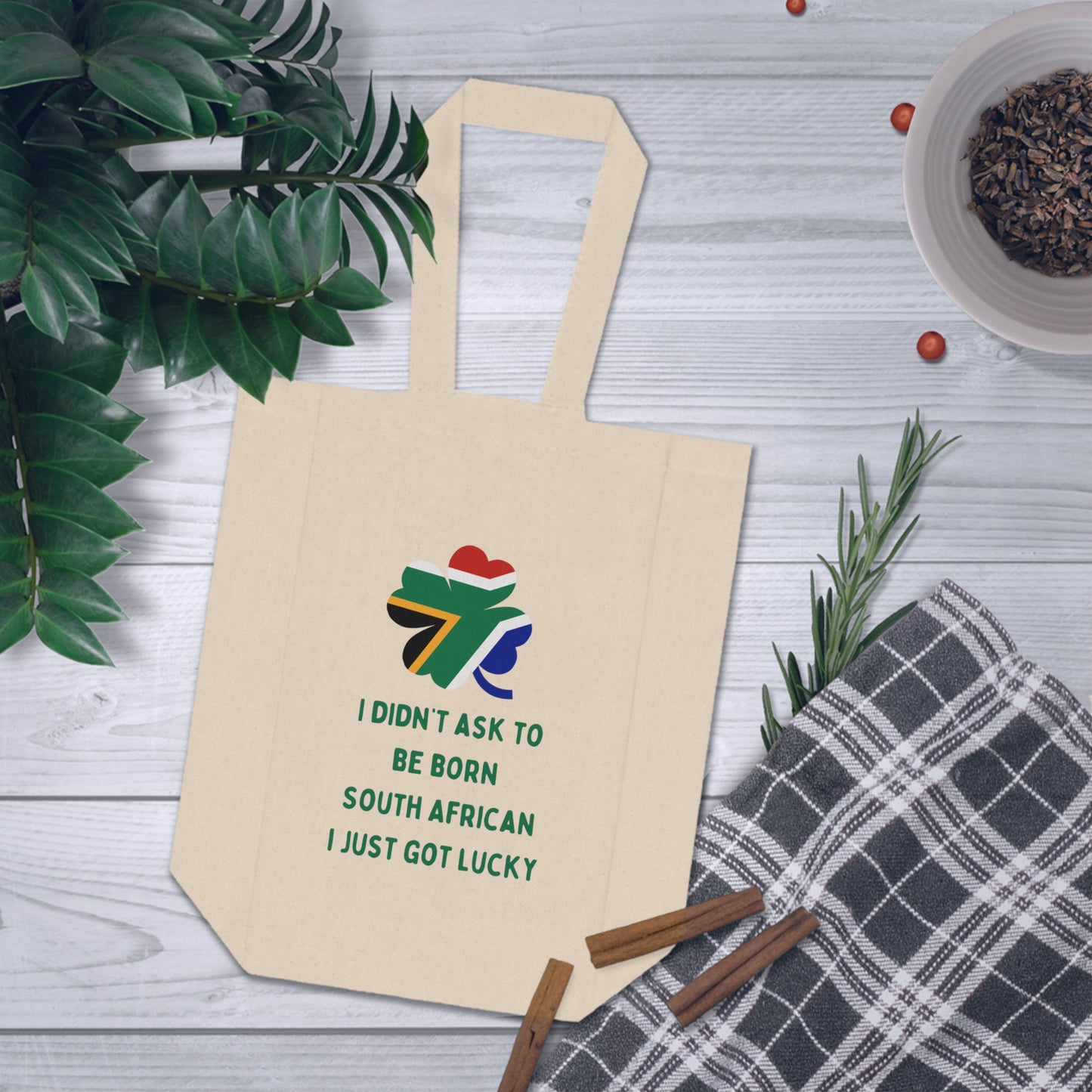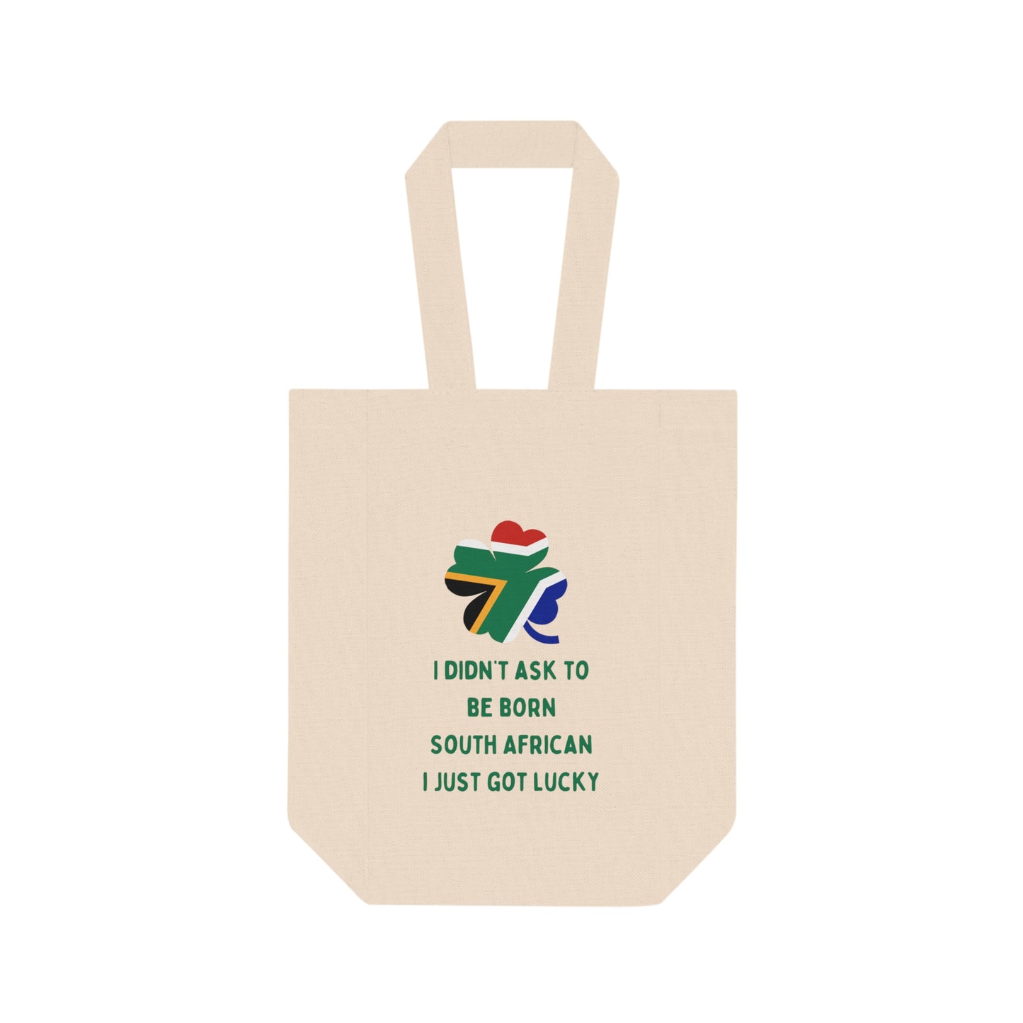 Simply put, a wine-lover's favorite. This double Lucky South African wine tote bag is made with 100% cotton canvas and features a handy partition to perfectly hold 2x 25 fl Oz (750ml) wine bottles.