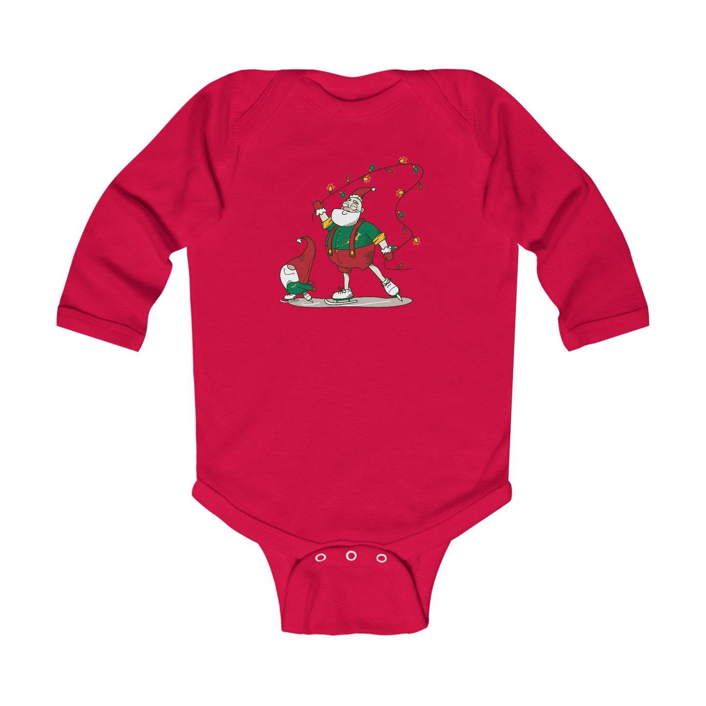 Any product designed for babies needs to hold up. The infant Santa Bok Fan Ice Skating Christmas long sleeve bodysuit does just that. Solid colors are 100% cotton. Other colors will include polyester. Either way, the fabric will be smooth and soft against the young one's skin. There are plastic snaps at the cross closure for easy changing. All bindings have ribbed knitting for durability and improved range of motion.