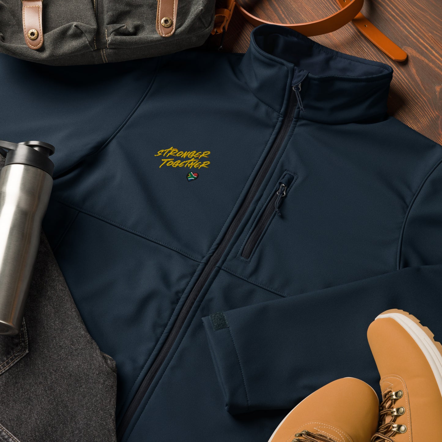 Tackle any weather with this Stronger Together soft shell jacket. Its wind and water-resistant material will keep you warm and dry during outdoor adventures and everyday use. With zippered pockets and adjustable features, this jacket offers a comfortable fit.